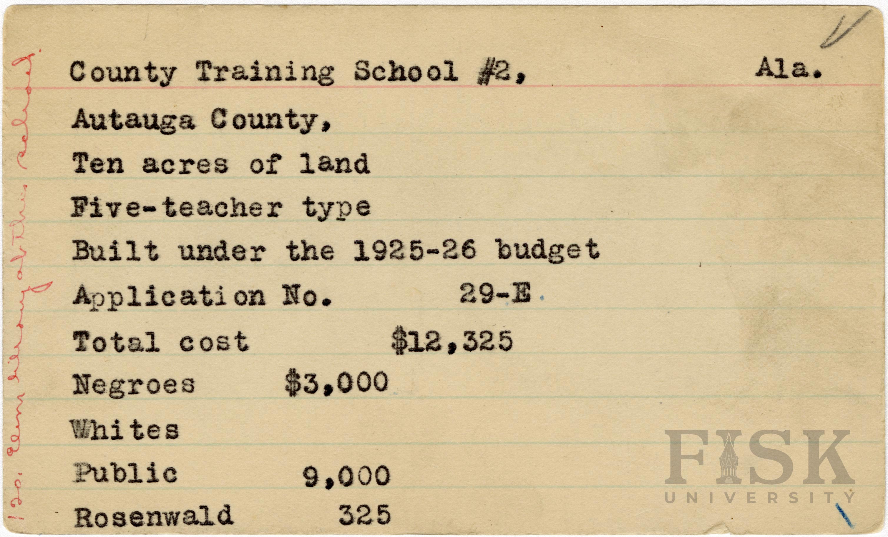 - School card from Rosenwald fund for County Training School #2 in Autauga County with a note in red pen on the left edge