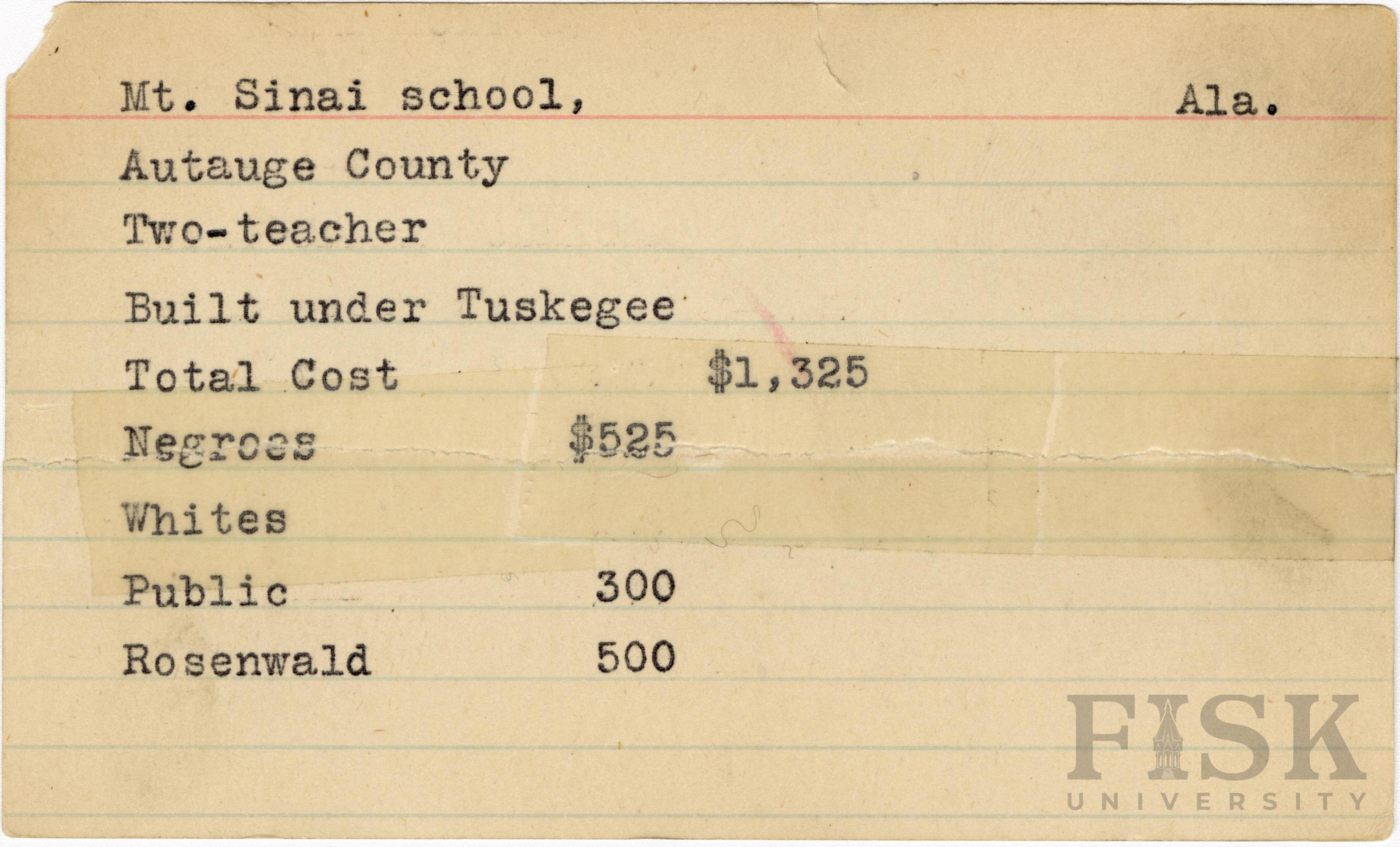 - School card from Rosenwald fund for Mt. Sinai School in Autauga County, Alabama with a note that says "Built under Tuskegee"