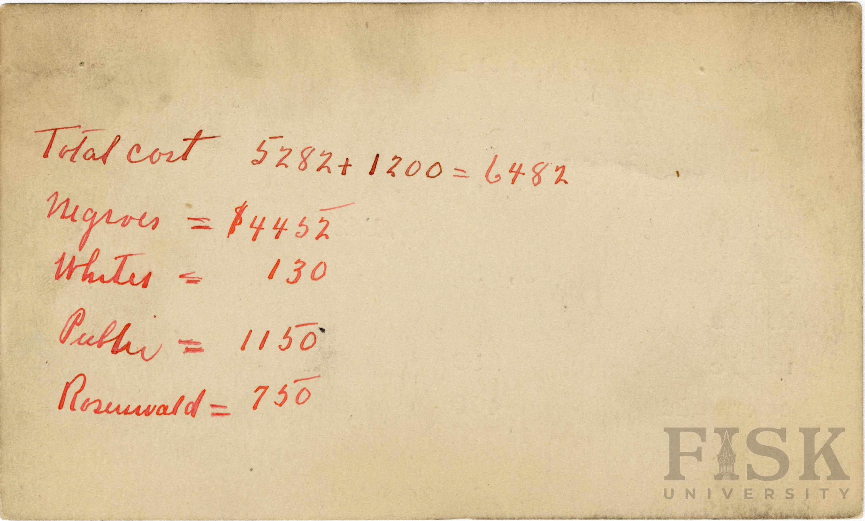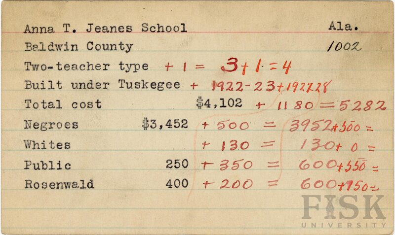 - School card from Rosenwald fund for Anna T. Jeanes School in Baldwin County, Alabama with handwritten notes adding to teacher type, budget years, and costs to each category in red pen. The back of the card has handwritten notes adding to teacher type, budget years, and budget contributions in red pen.
