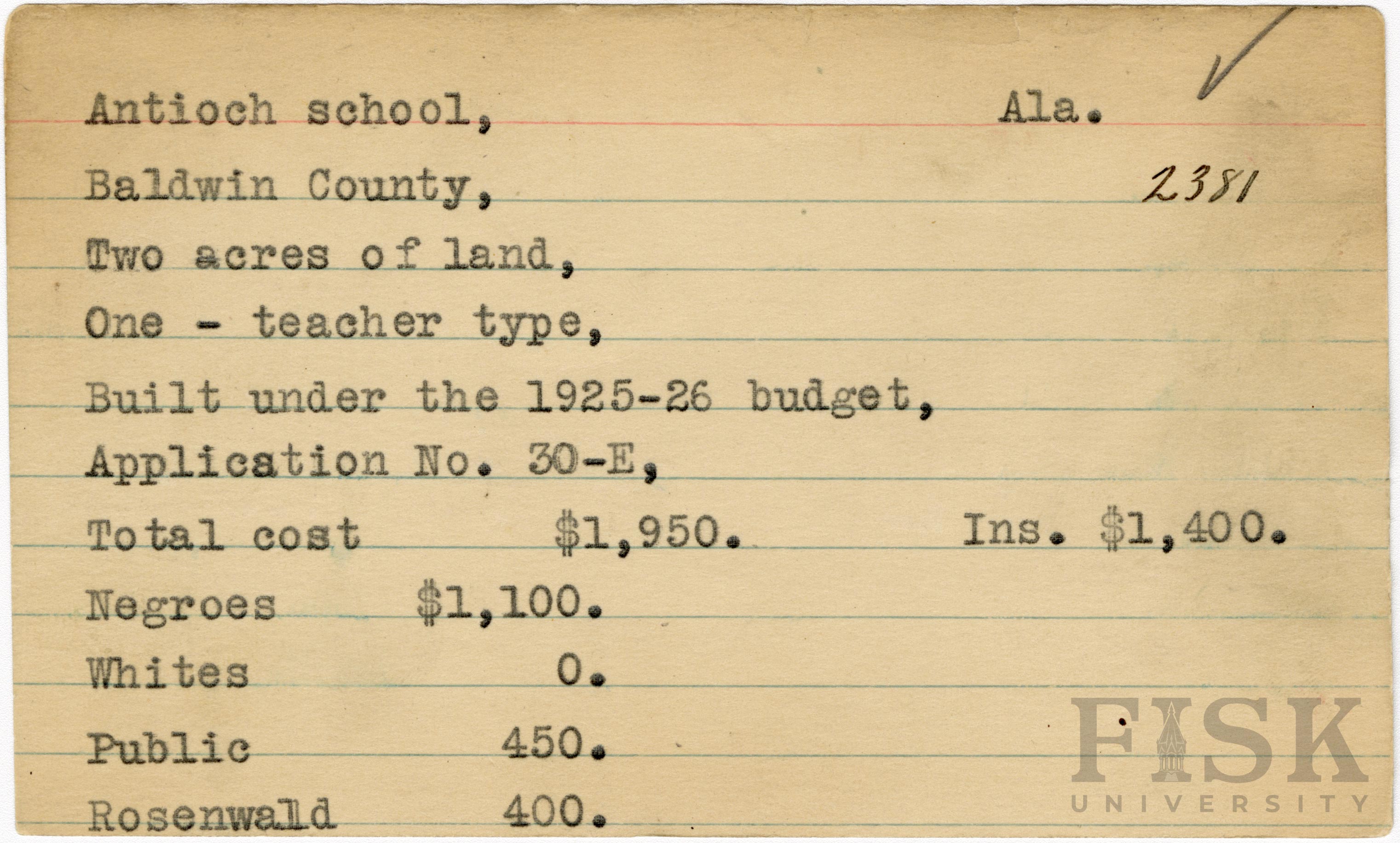 - School card from Rosenwald fund for Antioch School in Baldwin County, Alabama. Additional section added to budget information that says "Ins. $1,400"