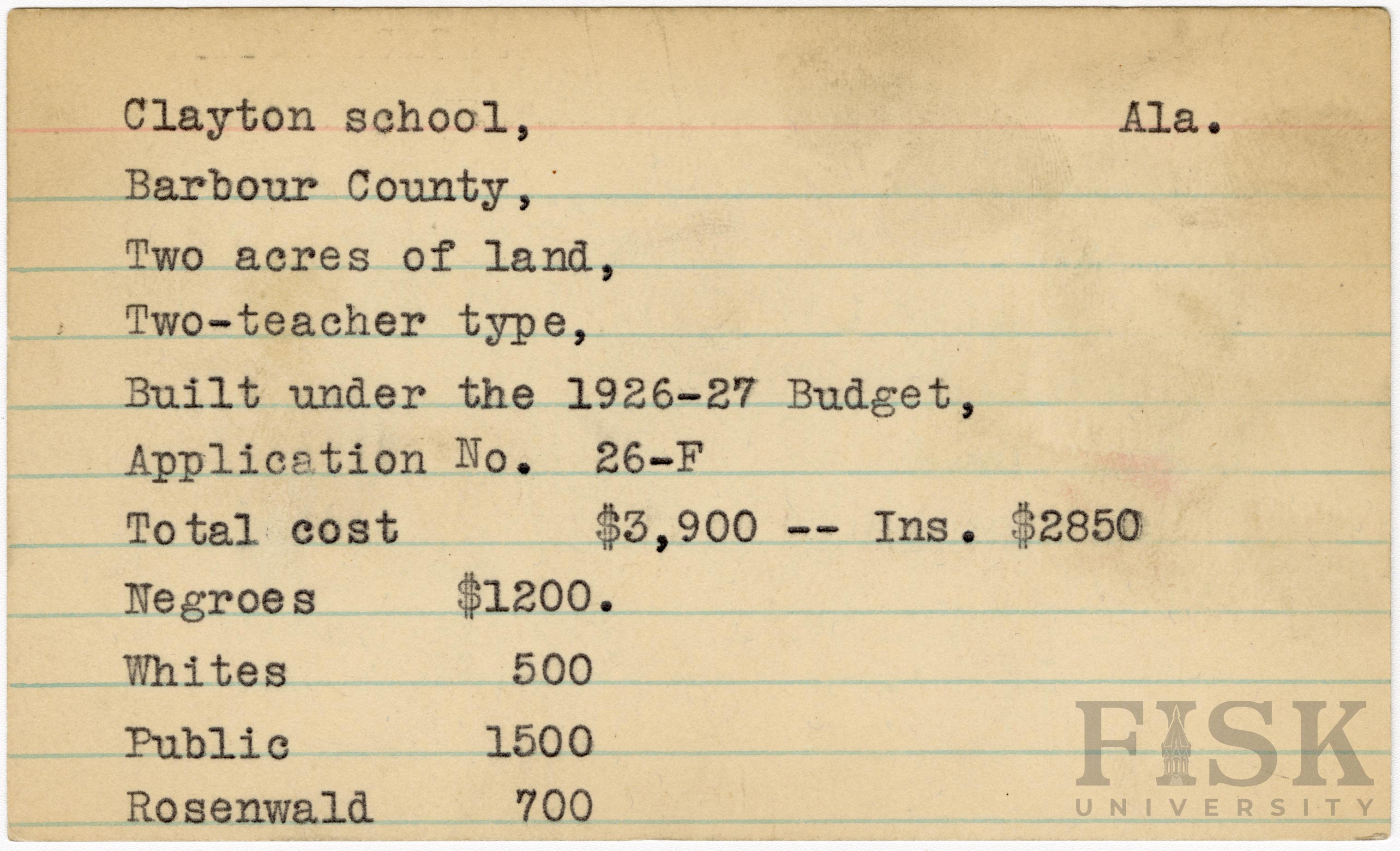 School card from Rosenwald fund for Clayton School in Barbour County, Alabama with an addition made to the budget contributions that says "Ins. $2,850"