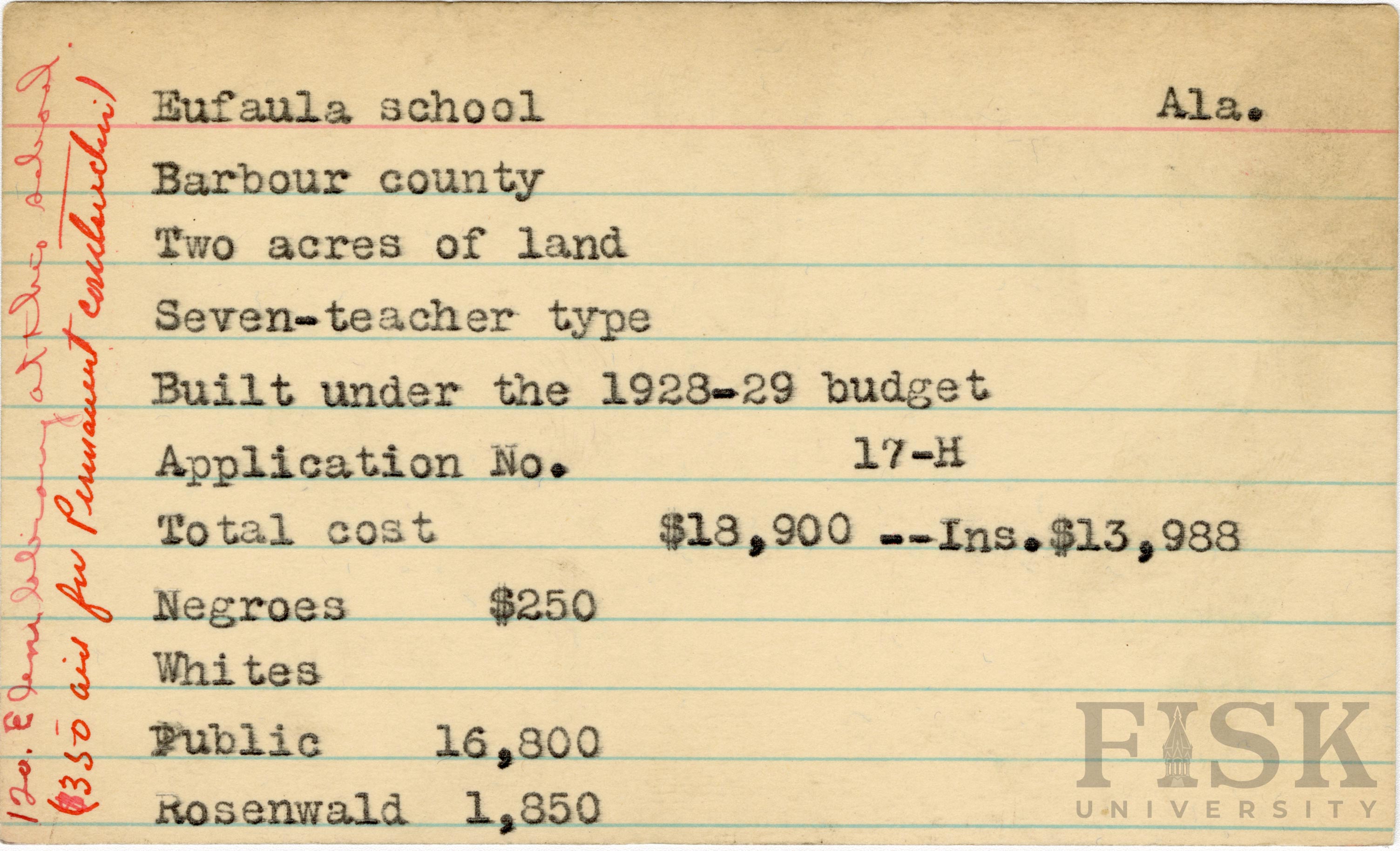 - School card from Rosenwald fund for Eufaula School in Barbour County, Alabama with an addition made to the budget contributions that says, "Ins. $13,988"
