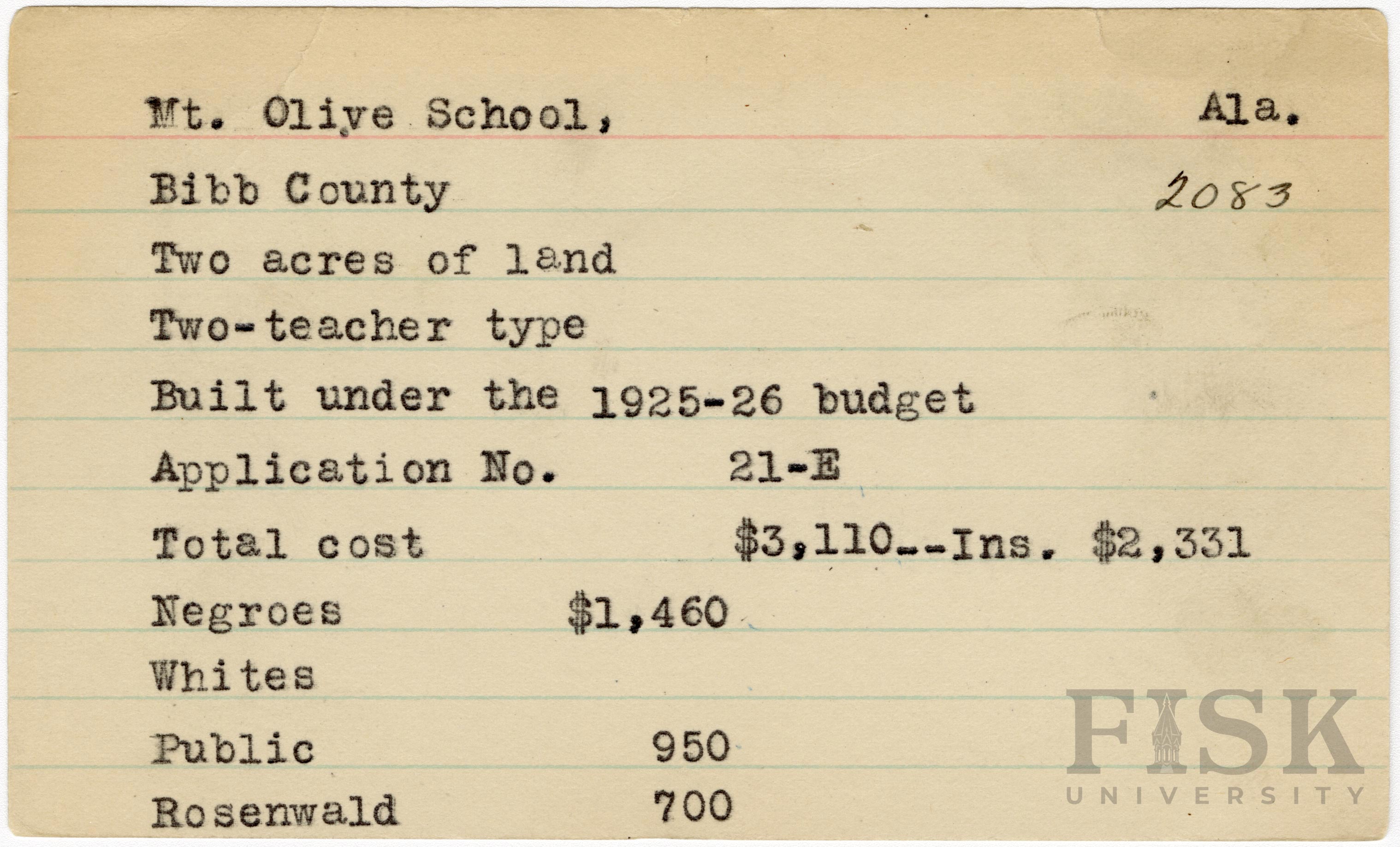 School card from Rosenwald Fund for Mt. Olive School in Bibb County, Alabama with a section added to the budget contributions that says, "Ins. $2,331"