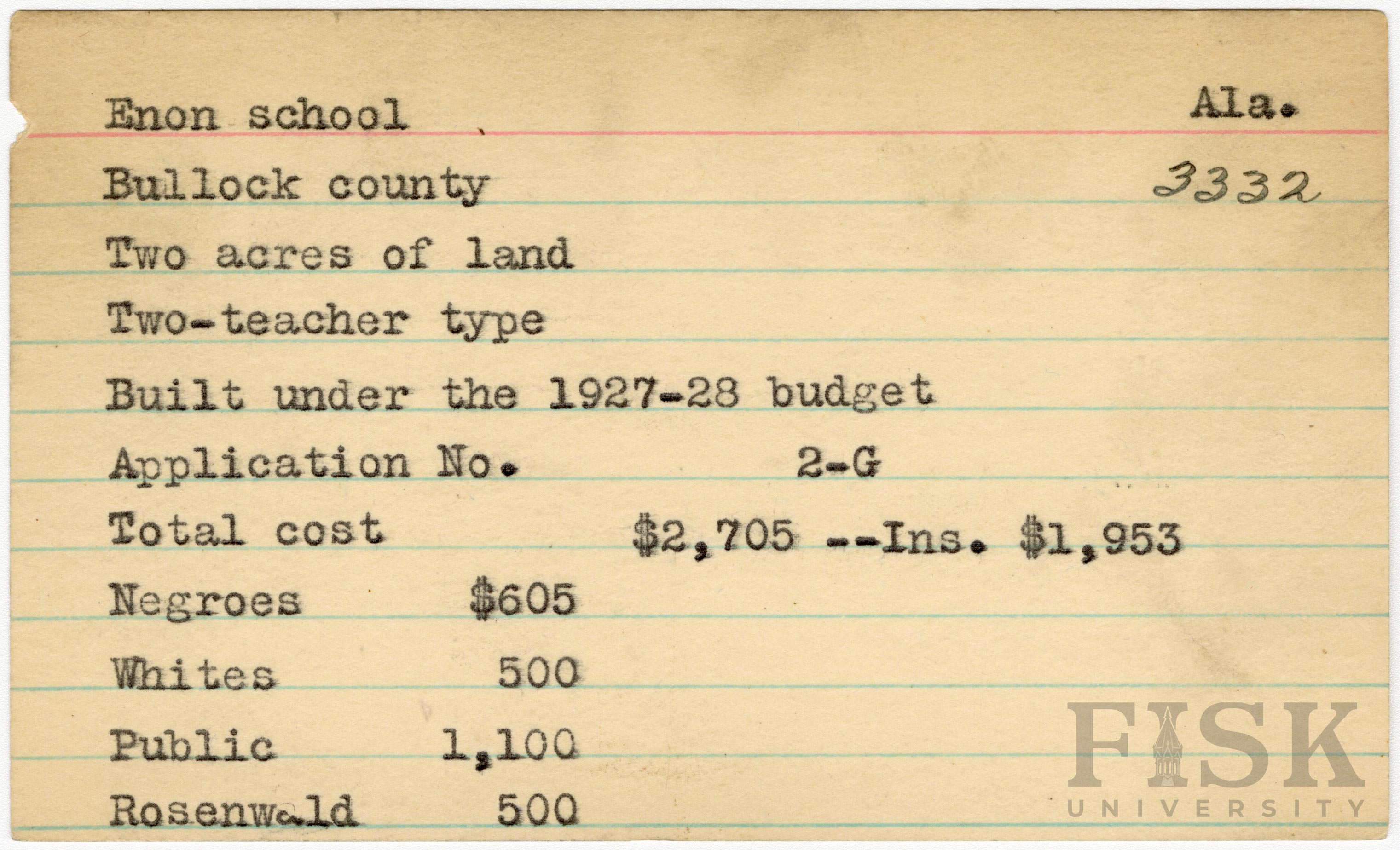 School card from Rosenwald Fund for Enon School in Bullock County, Alabama with a section added to the budget contributions that says, "Ins. $1,953"