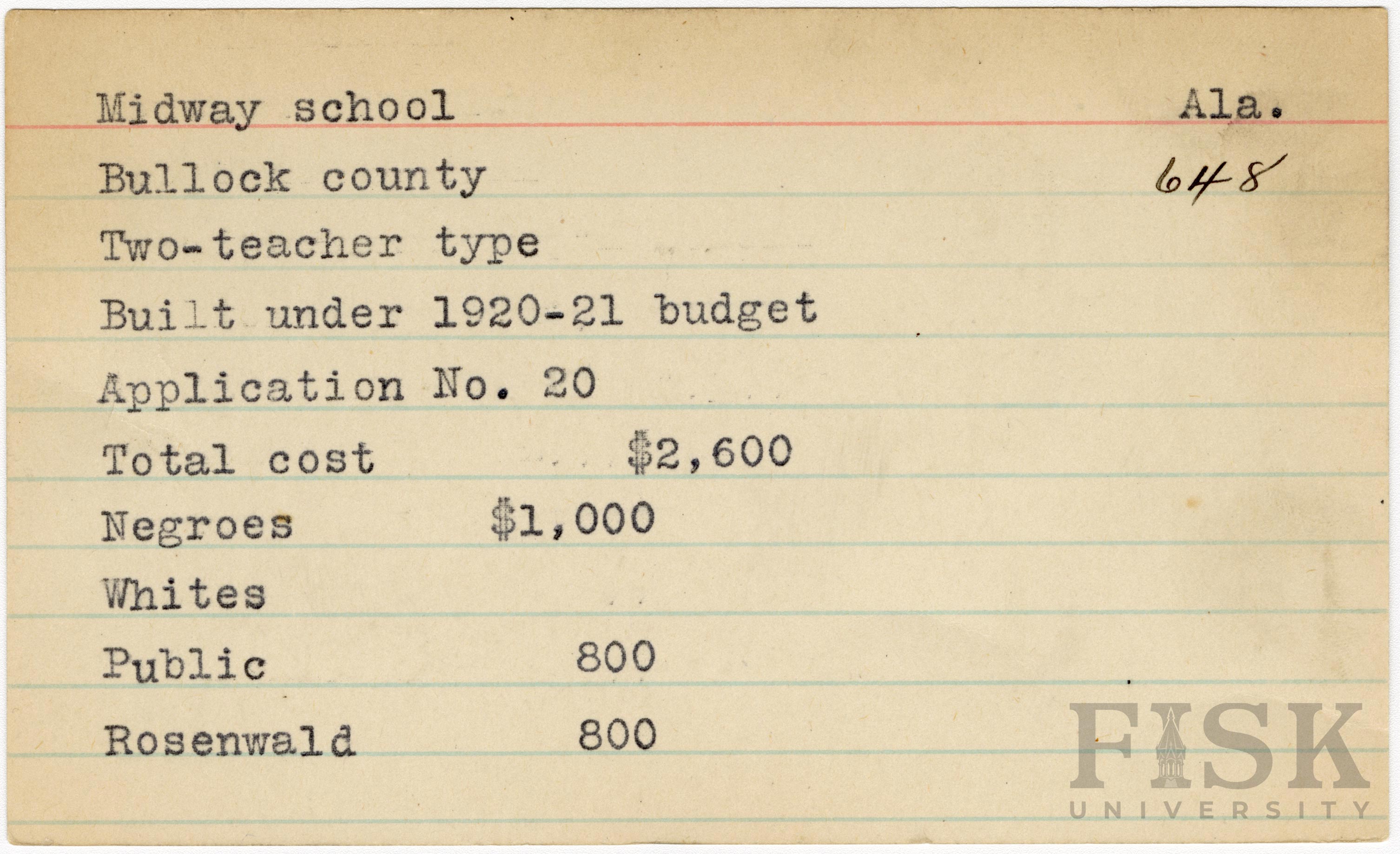 - School card from Rosenwald Fund for Midway School in Bullock County, Alabama