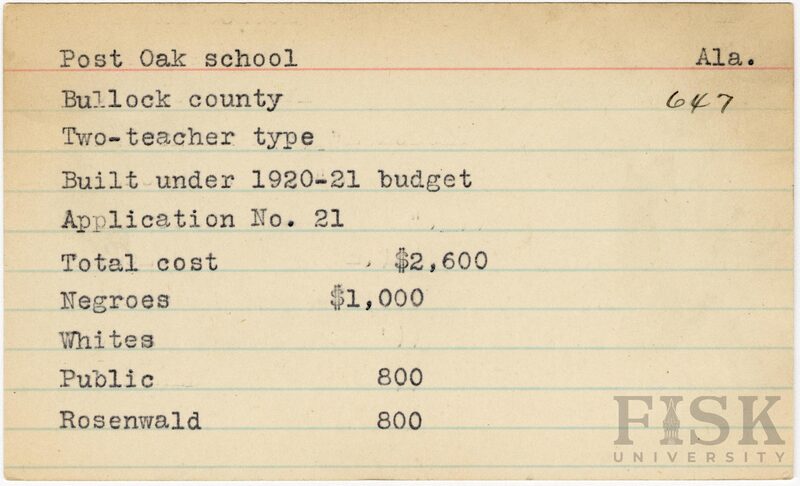 - School card from Rosenwald Fund for Post Oak School in Bullock County, Alabama