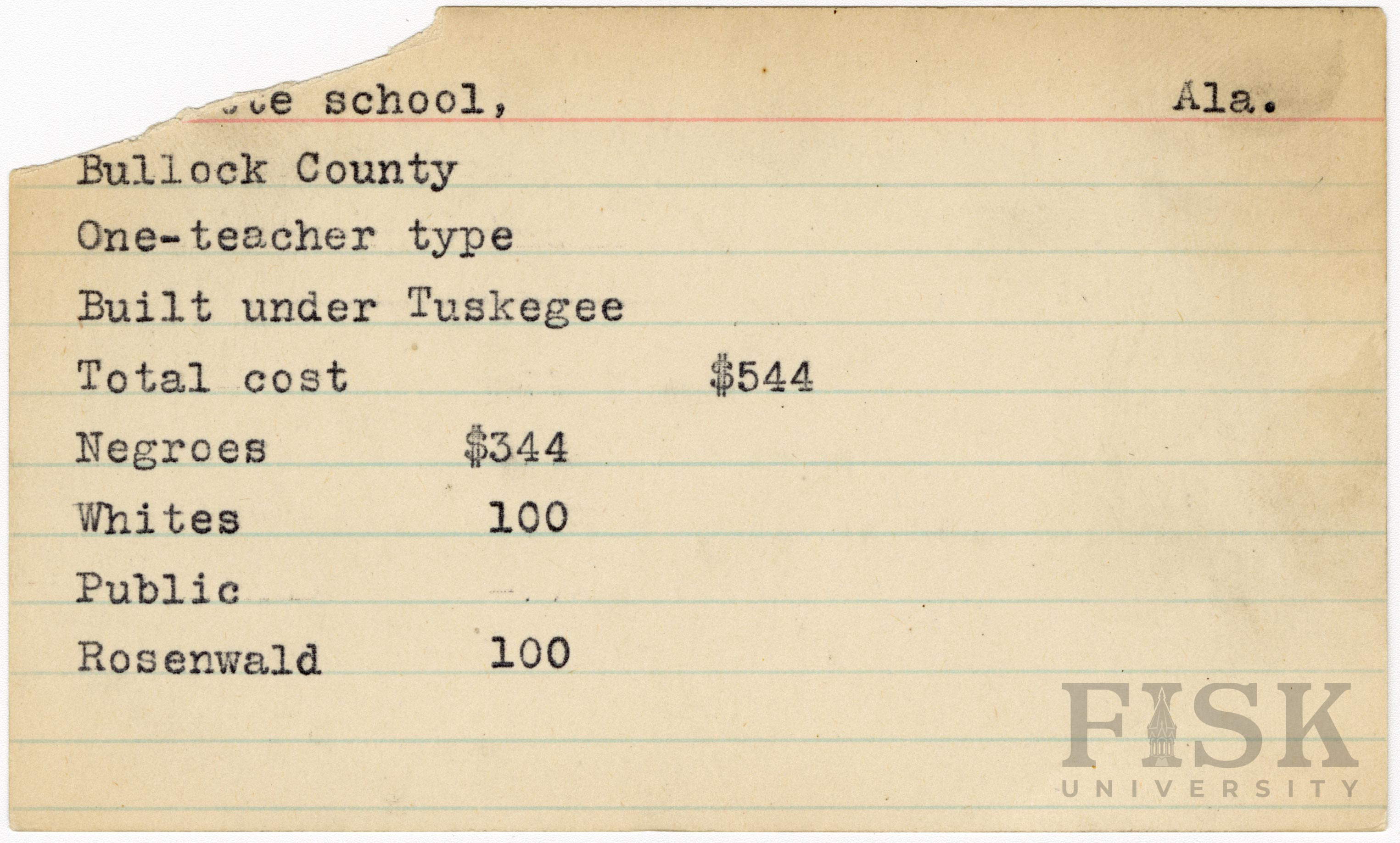 - School card from Rosenwald Fund for an unknown school in Bullock County, Alabama. The card is torn in the top left where the school name is typed.