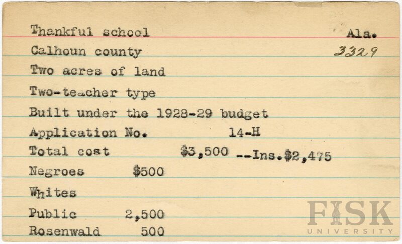 - School card from Rosenwald Fund for Thankful School in Calhoun County, Alabama with a section added to the budget contributions that says, "Ins. $2,475"