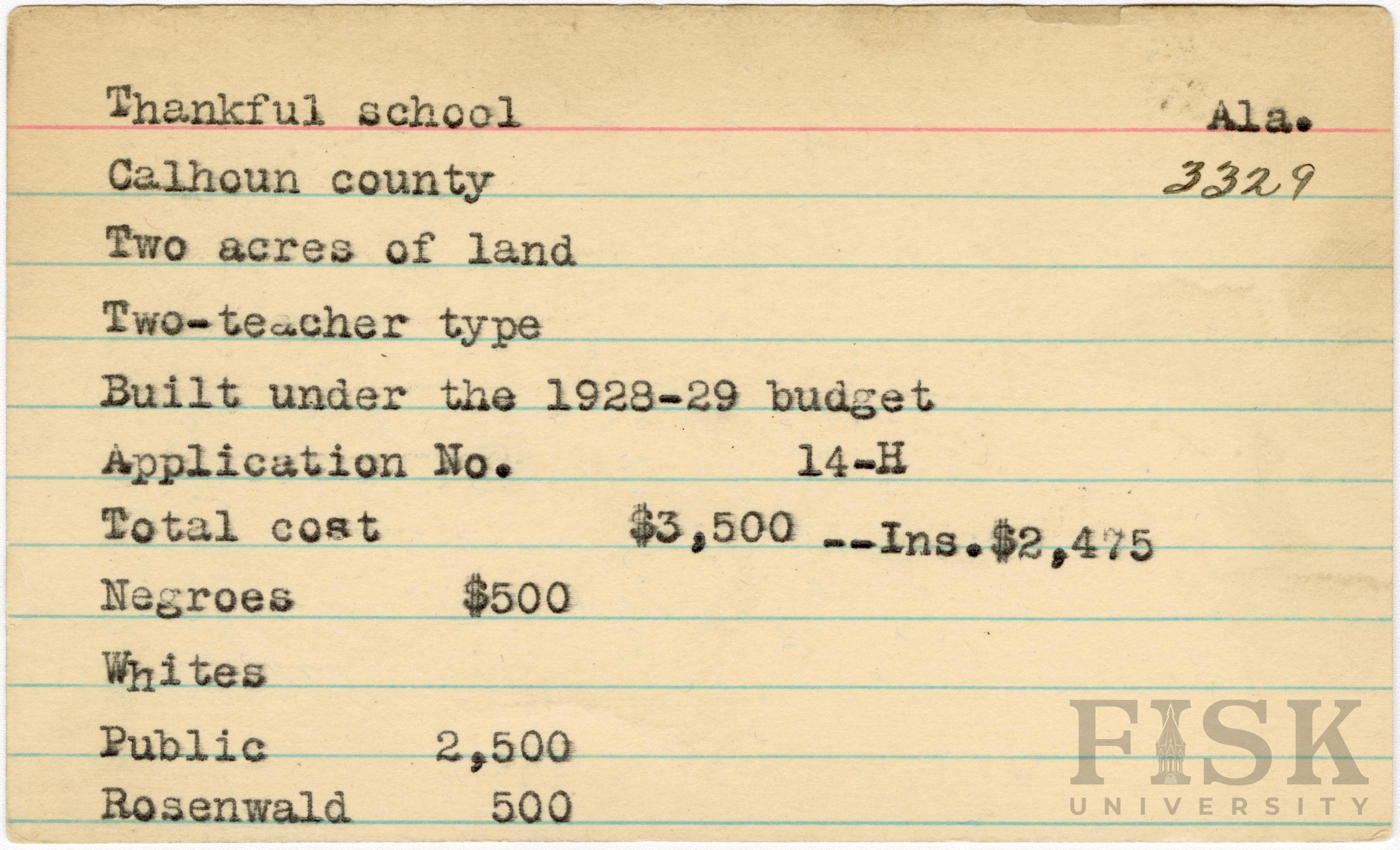 School card from Rosenwald Fund for Thankful School in Calhoun County, Alabama with a section added to the budget contributions that says, "Ins. $2,475"