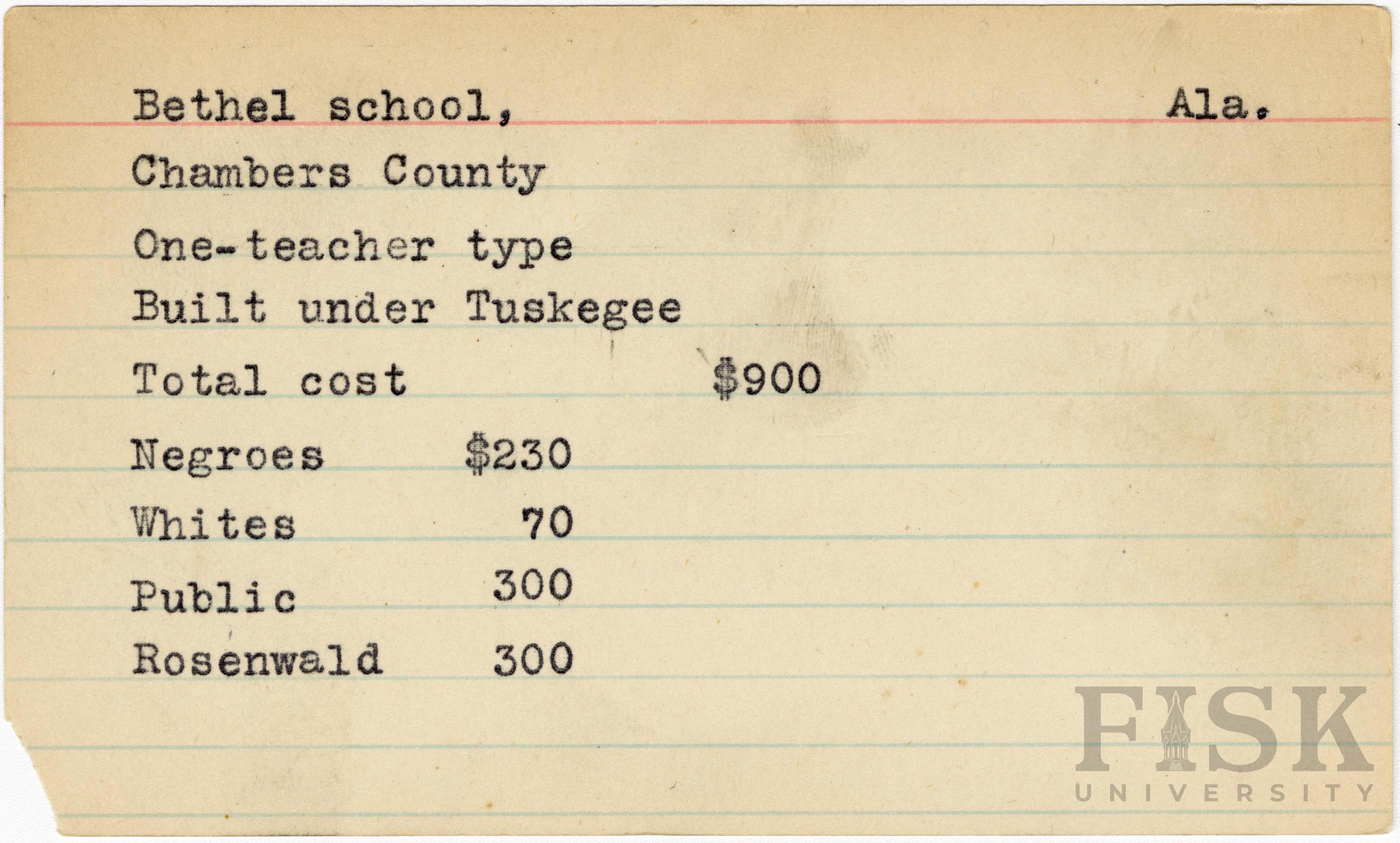 - School card from Rosenwald Fund for Bethel School in Chambers County, Alabama