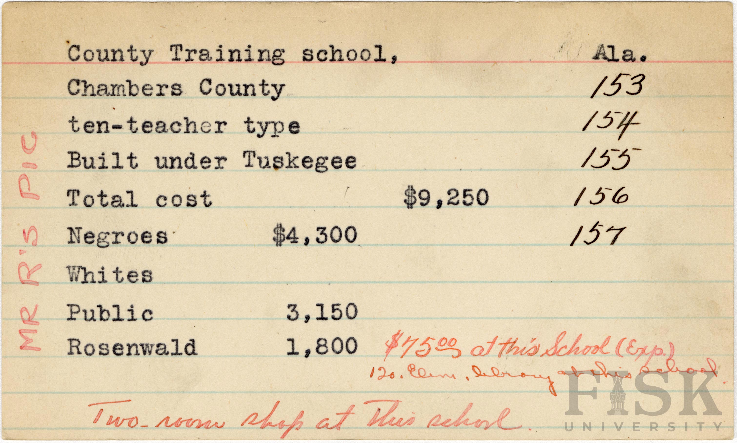 - School card from Rosenwald Fund for County Training School in Chambers County, Alabama with notes in red. One note says "Mr. R's Pic". Another note says "Two room shop at this school"