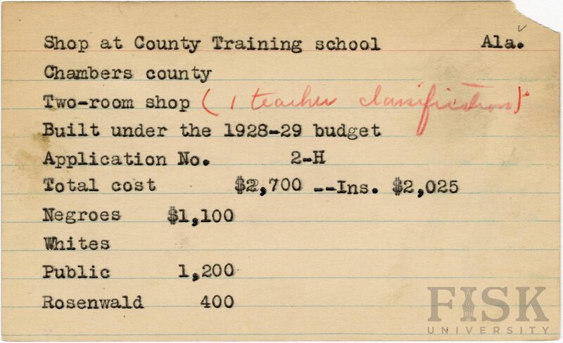- School card from Rosenwald Fund for the two-room shop at County Training School in Chambers County, Alabama with a section added to the budget contributions that says, "Ins. $2,025