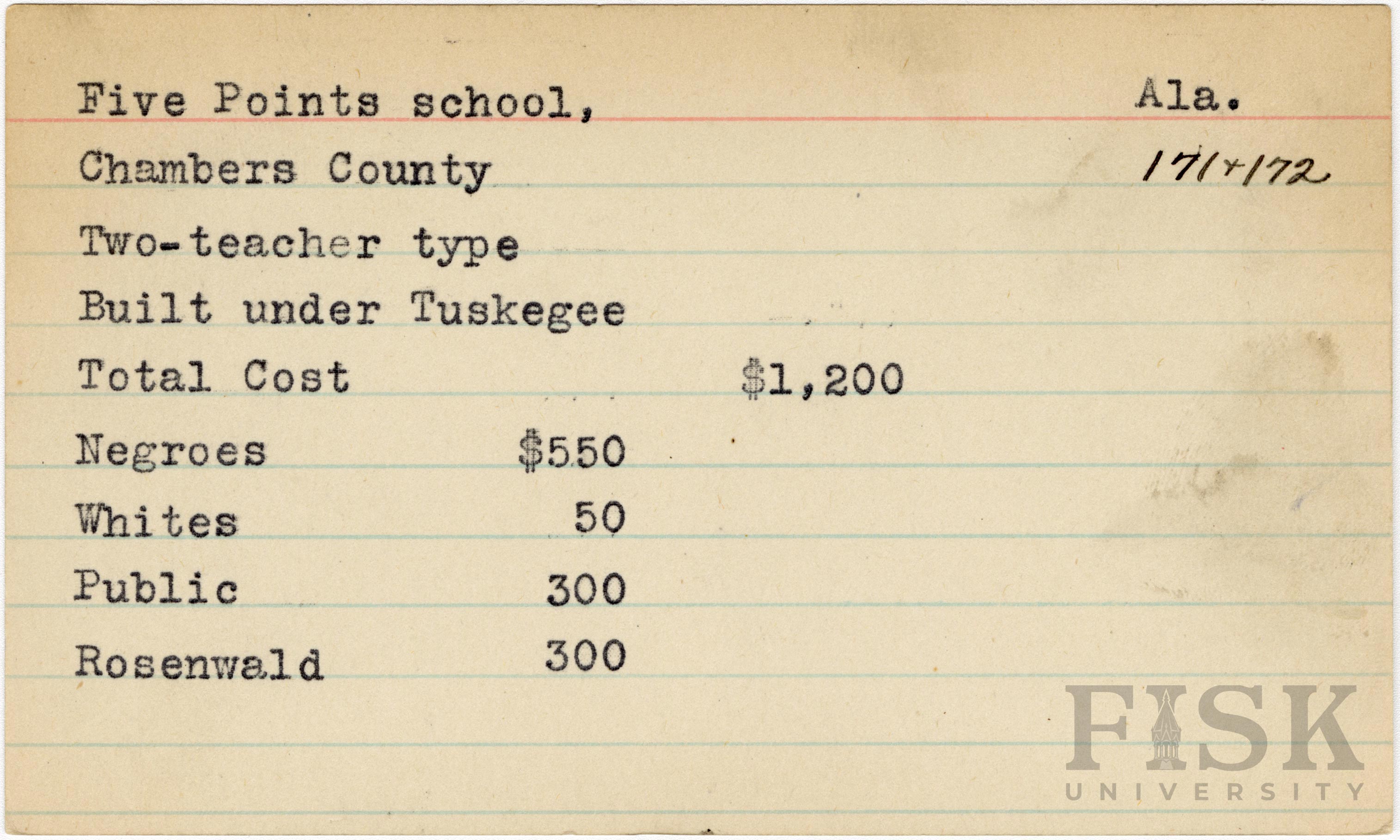 - School card from Rosenwald Fund for Five Points School in Chambers County, Alabama