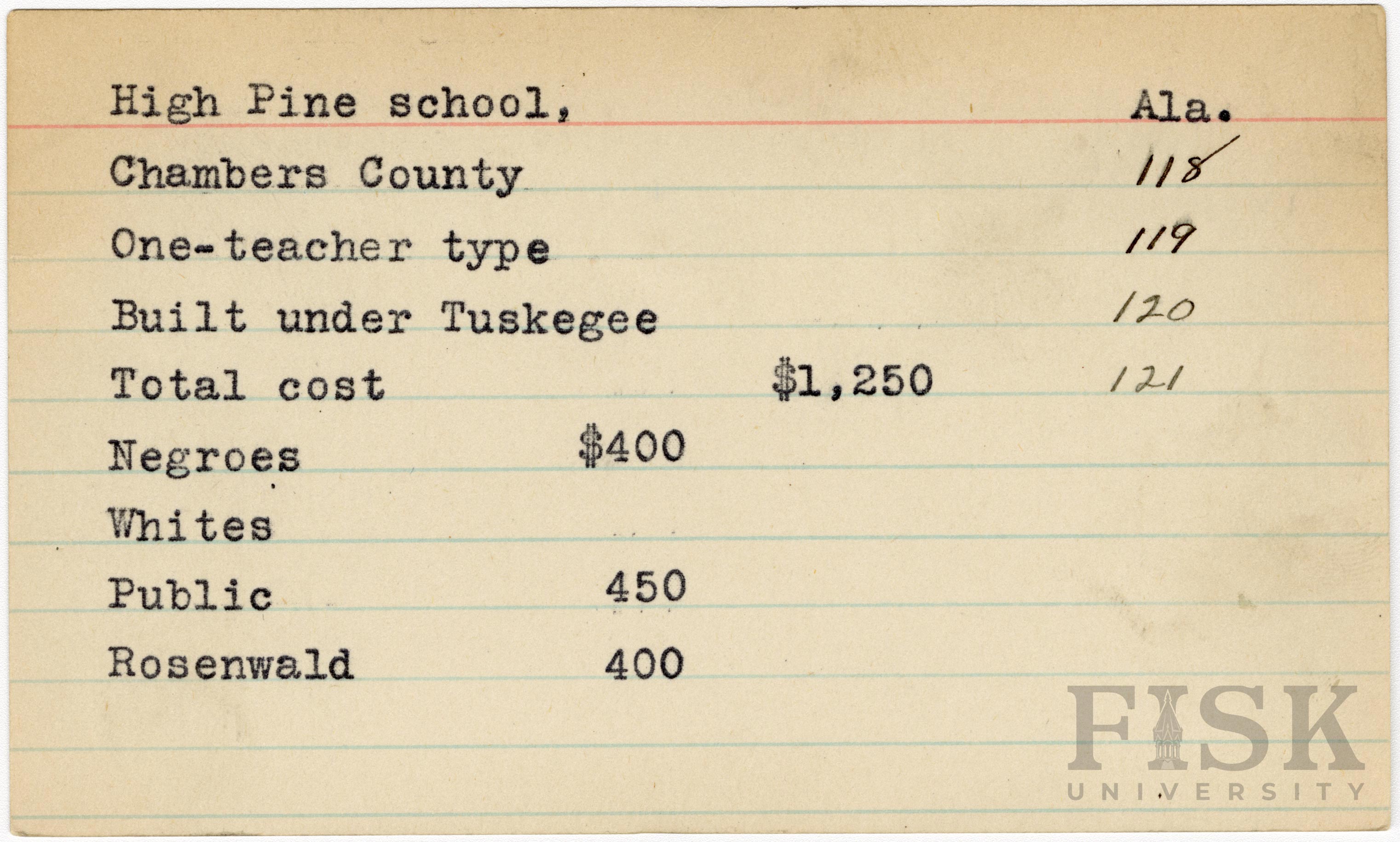 School card from Rosenwald Fund for High Pine School in Chambers County, Alabama