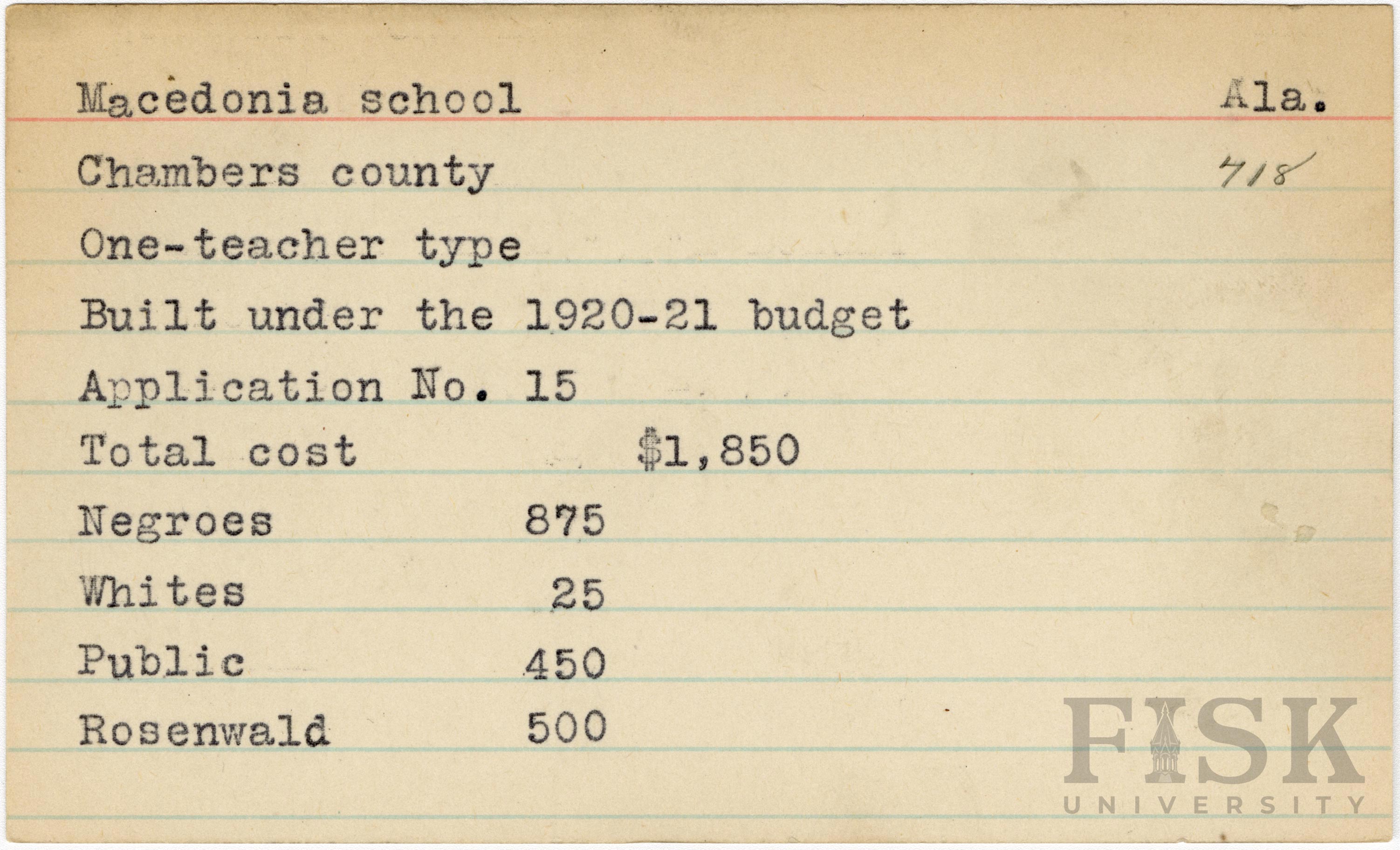 - School card from Rosenwald Fund for Macedonia School in Chambers County, Alabama