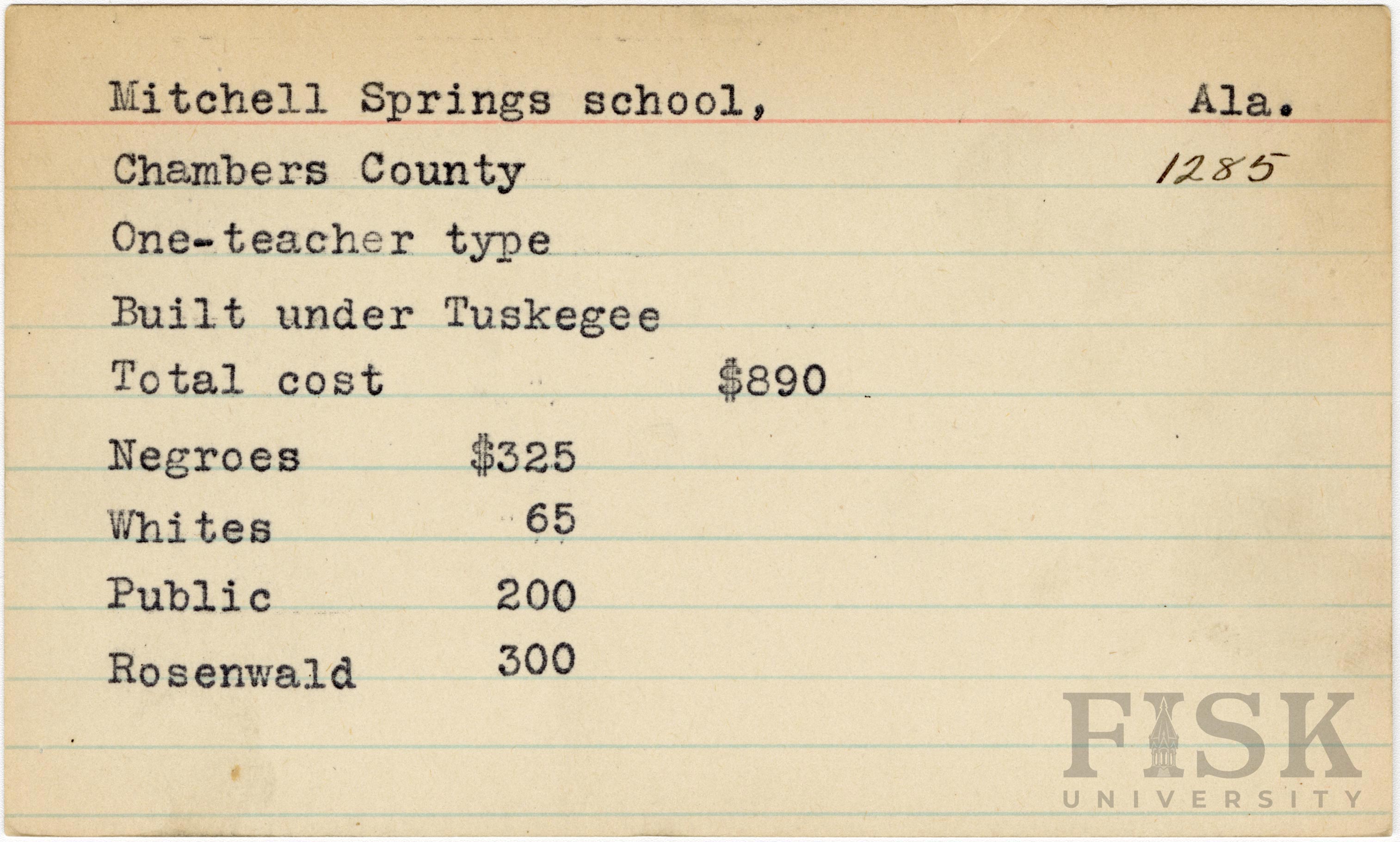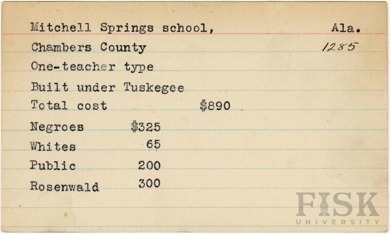 - School card from Rosenwald Fund for Mitchell Springs School in Chambers County, Alabama