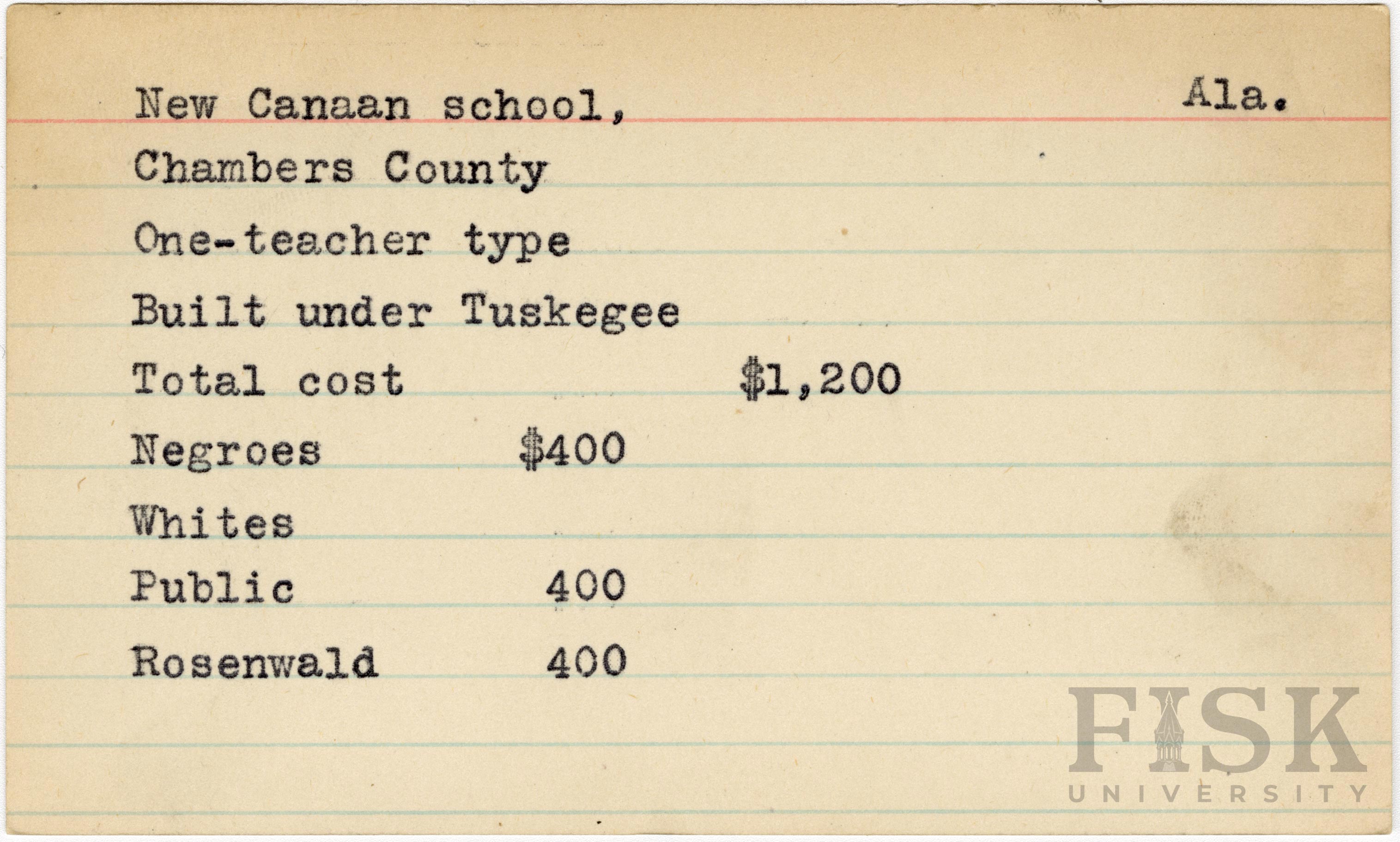 - School card from Rosenwald Fund for New Canaan School in Chambers County, Alabama