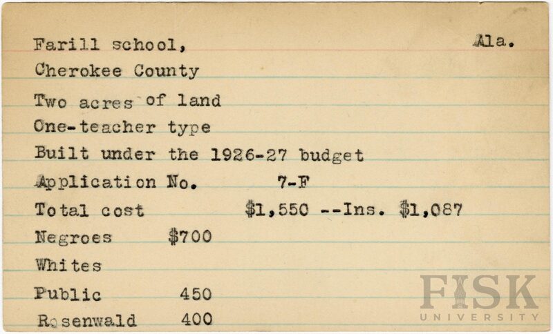School card from Rosenwald Fund for Farill School in Cherokee County, Alabama with a section added to the budget contributions that says, "Ins. $1,087"