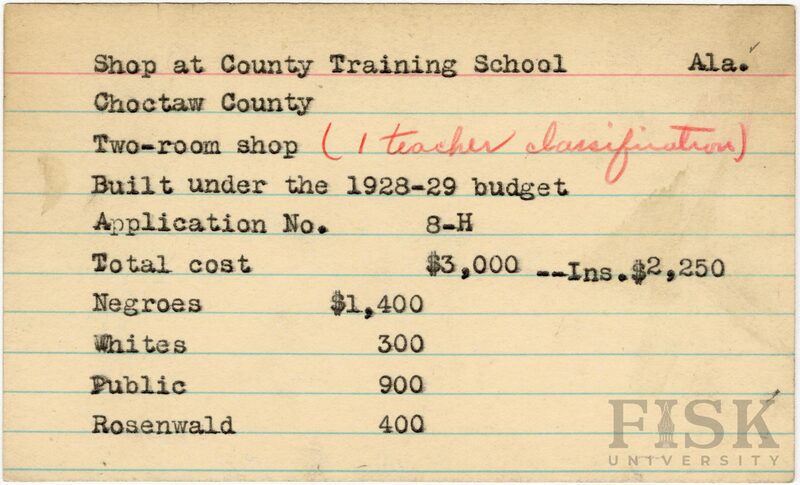 - School card from Rosenwald Fund for the shop at County Training School in Choctaw County, Alabama