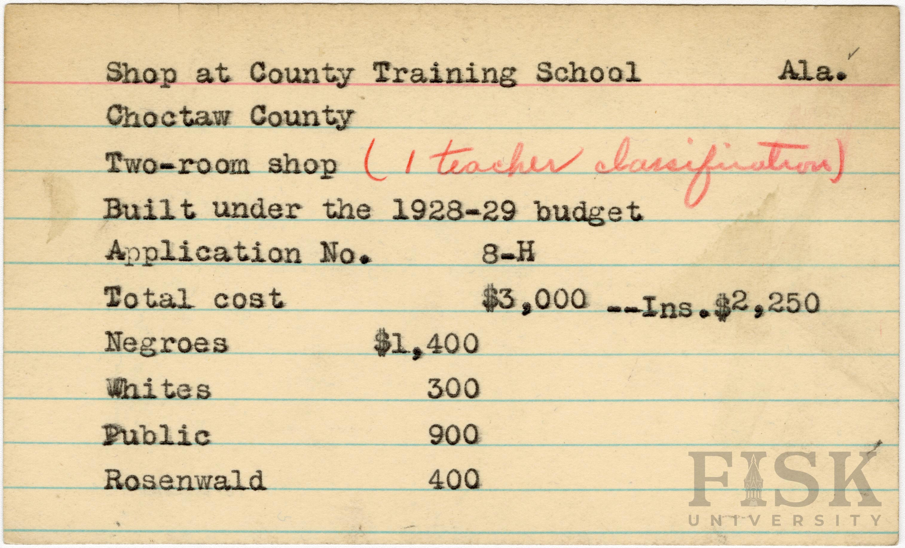 School card from Rosenwald Fund for the shop at County Training School in Choctaw County, Alabama