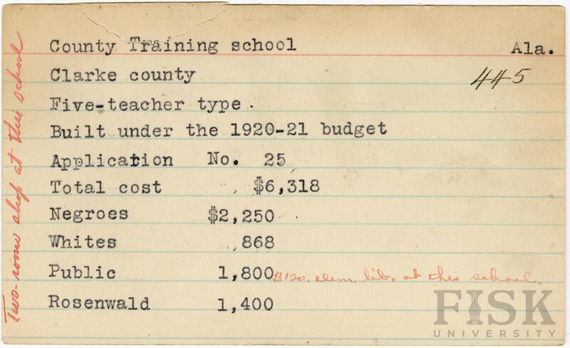 - School card from Rosenwald Fund for County Training School in Clarke County, Alabama with 2 handwritten notes. On the far left of the card, it says, "Two-room shop at this school."