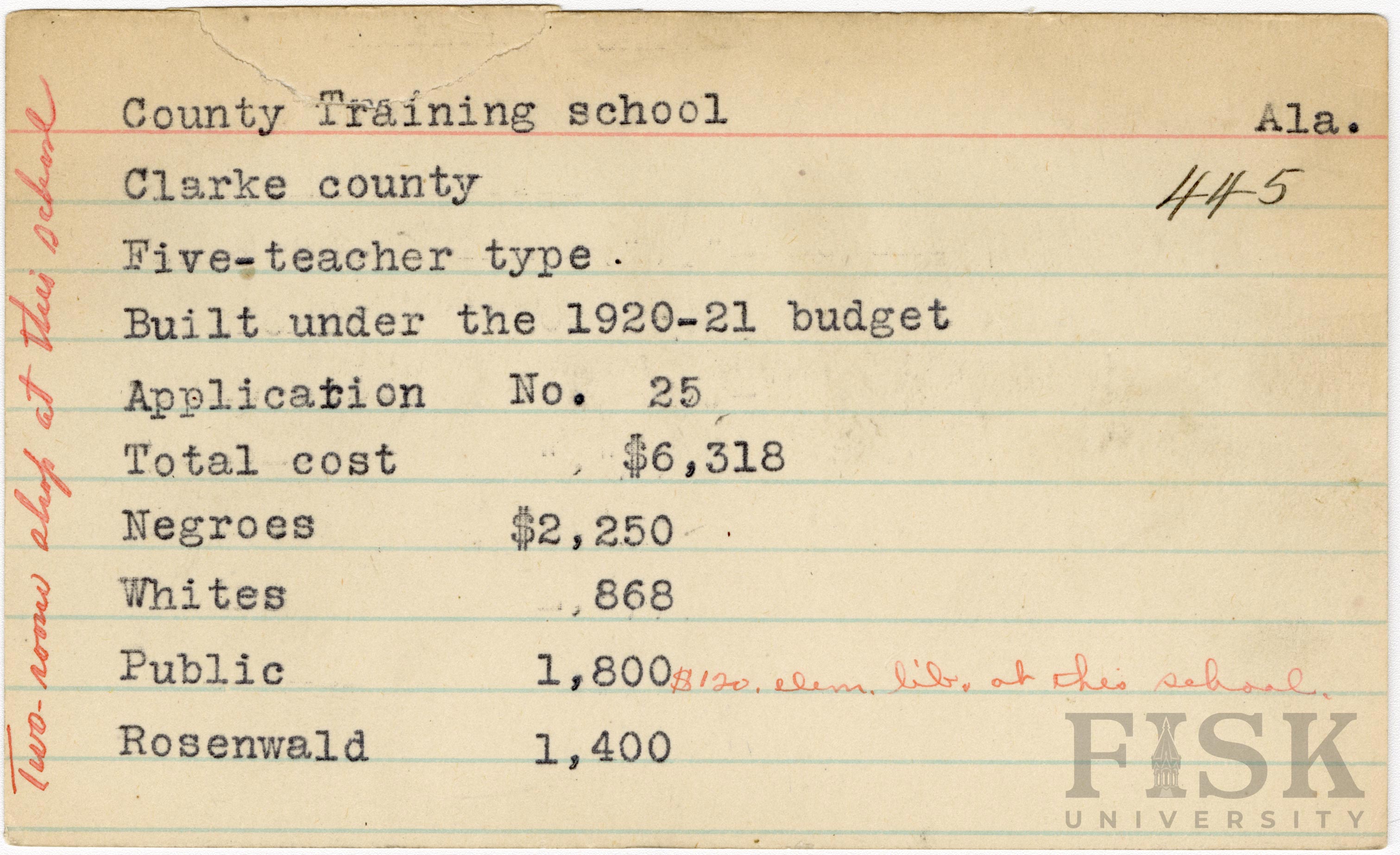 School card from Rosenwald Fund for County Training School in Clarke County, Alabama with 2 handwritten notes. On the far left of the card, it says, "Two-room shop at this school."