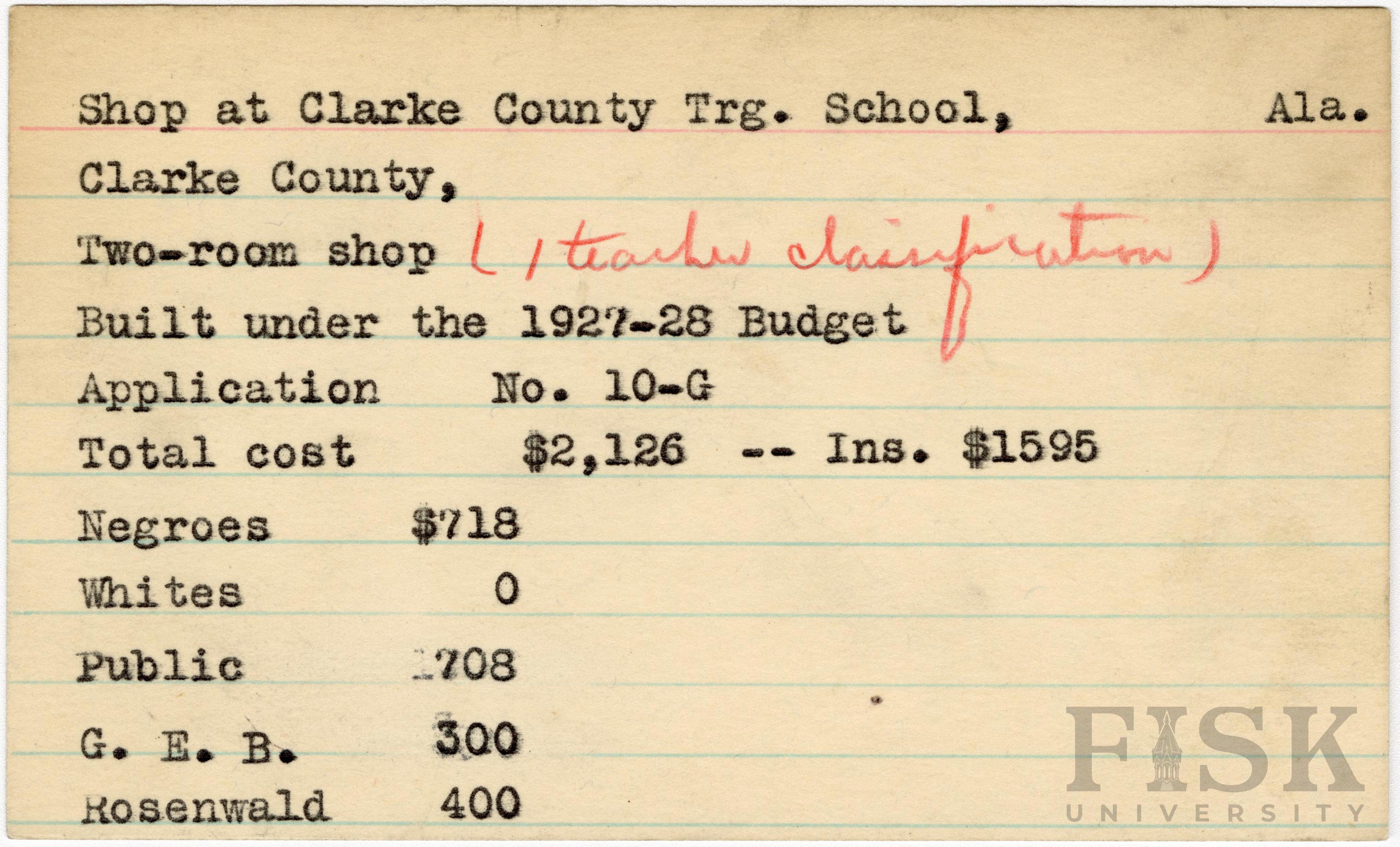 School card from Rosenwald Fund for the two-room shop at County Training School in Clarke County, Alabama with two sections added to the budget contributions that say, "Ins. $1,595" and "G.E.B. $300".