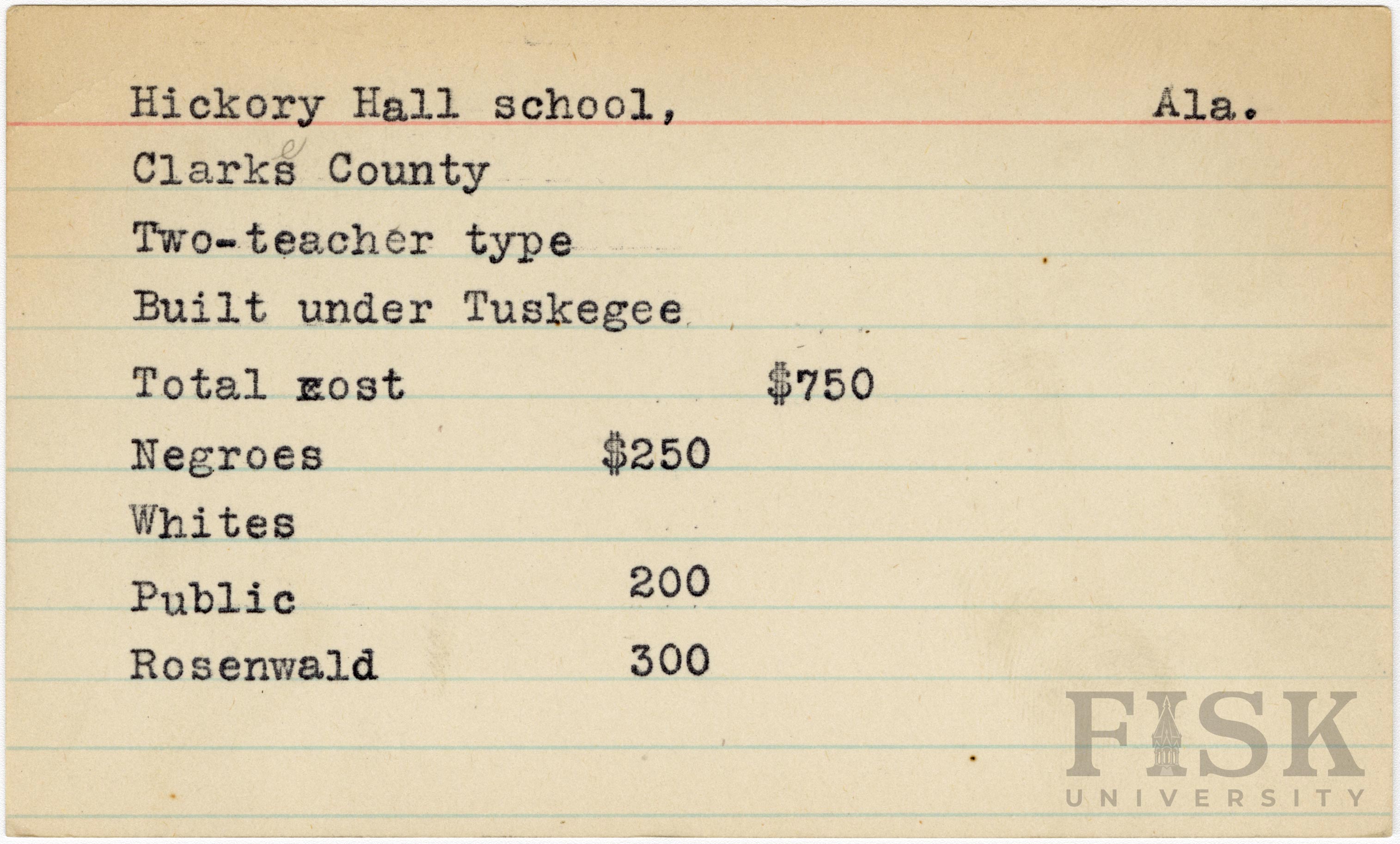 School card from Rosenwald Fund for Hickory Hill School in Clarke County, Alabama. County name is mispelled as "Clarks" on the card.