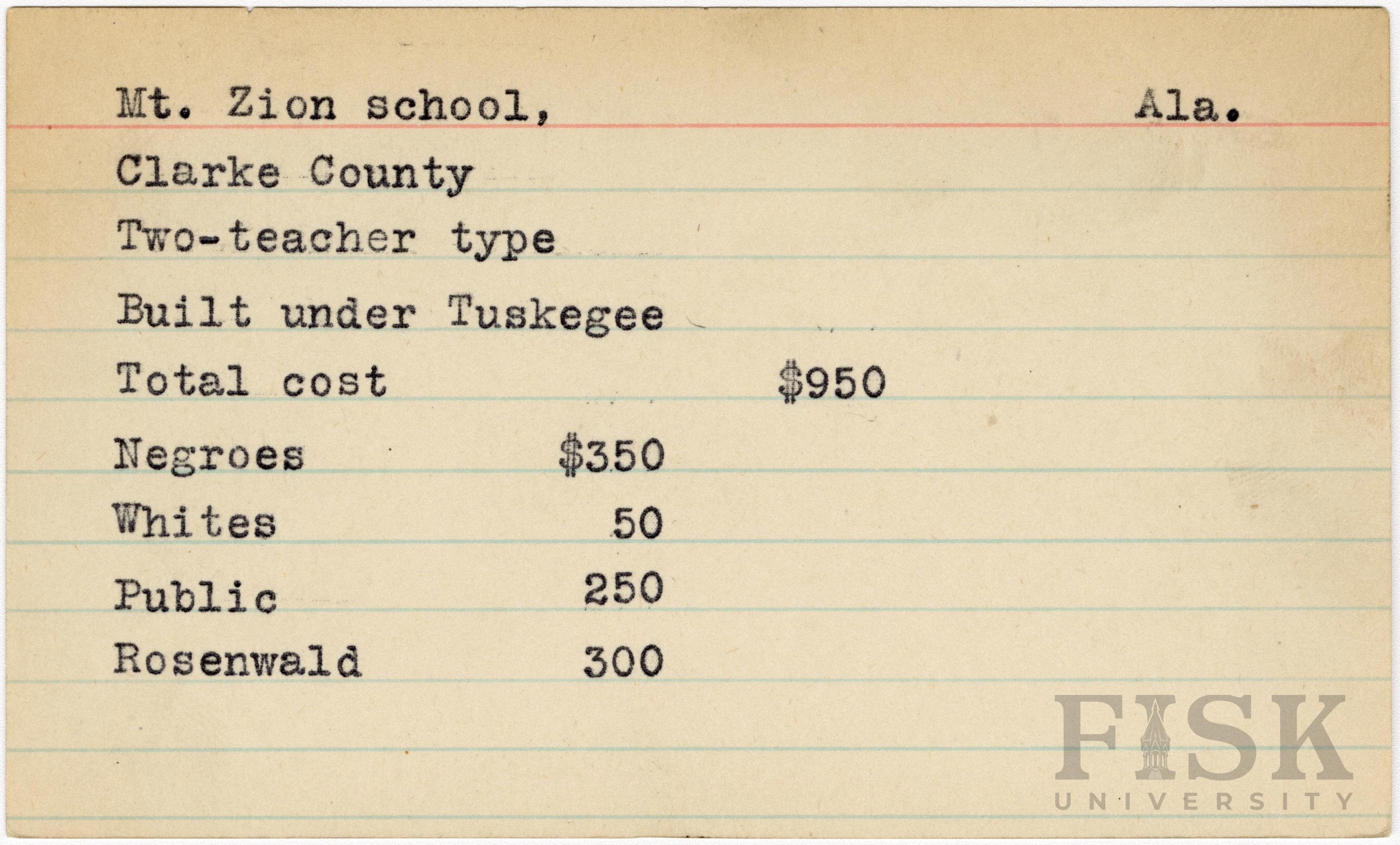- School card from Rosenwald Fund for Mt. Zion School in Clarke County, Alabama