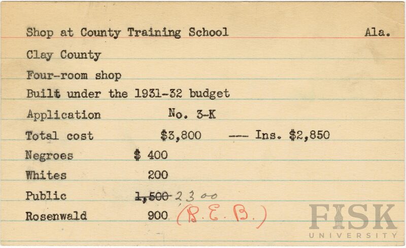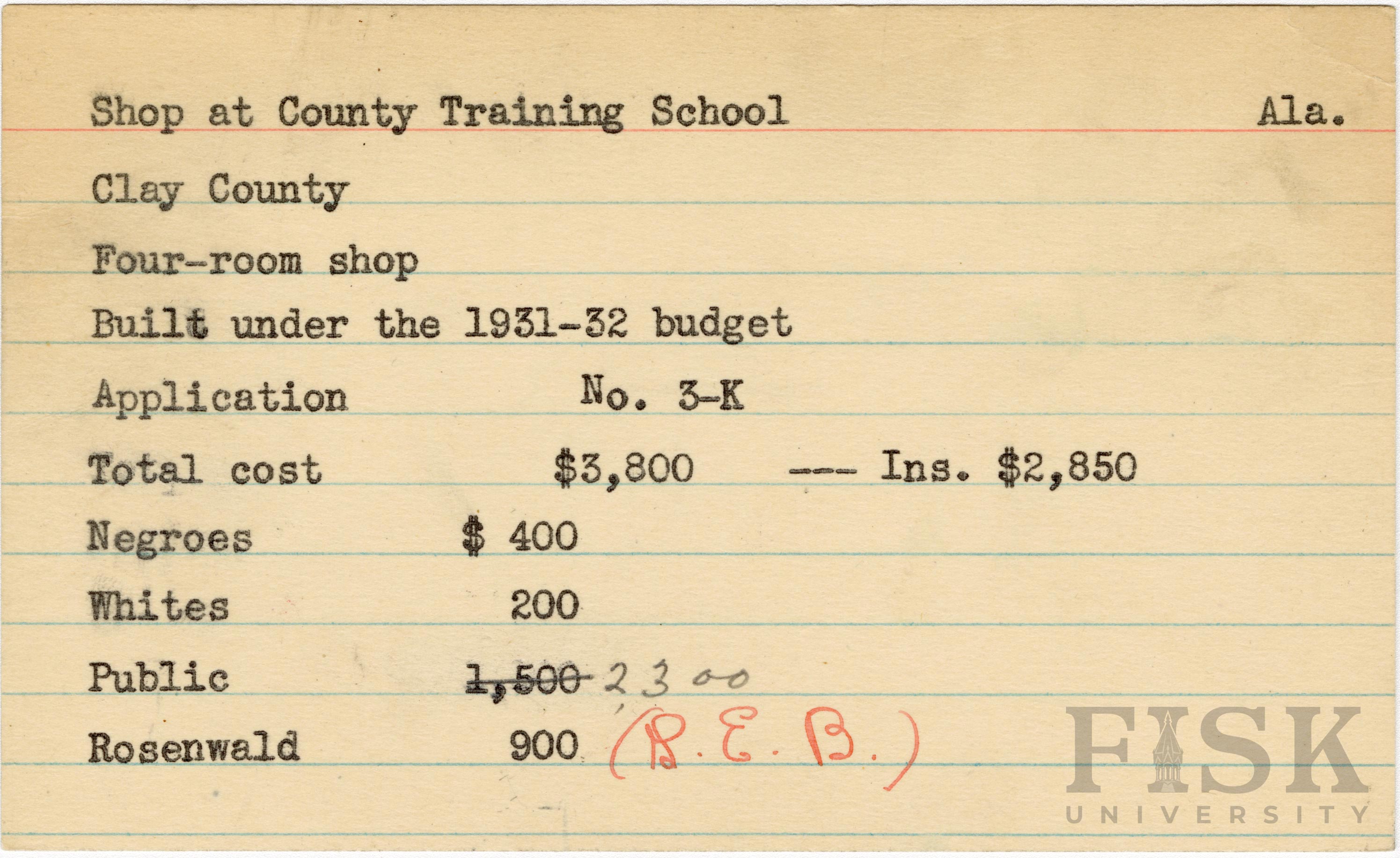 - School card from Rosenwald Fund for the four-room shop at County Training School in Clay County, Alabama with "(R.E.B.)" handwritten next to the Rosenwald section of the budget contributions and a section added that says "Ins. $2,850"