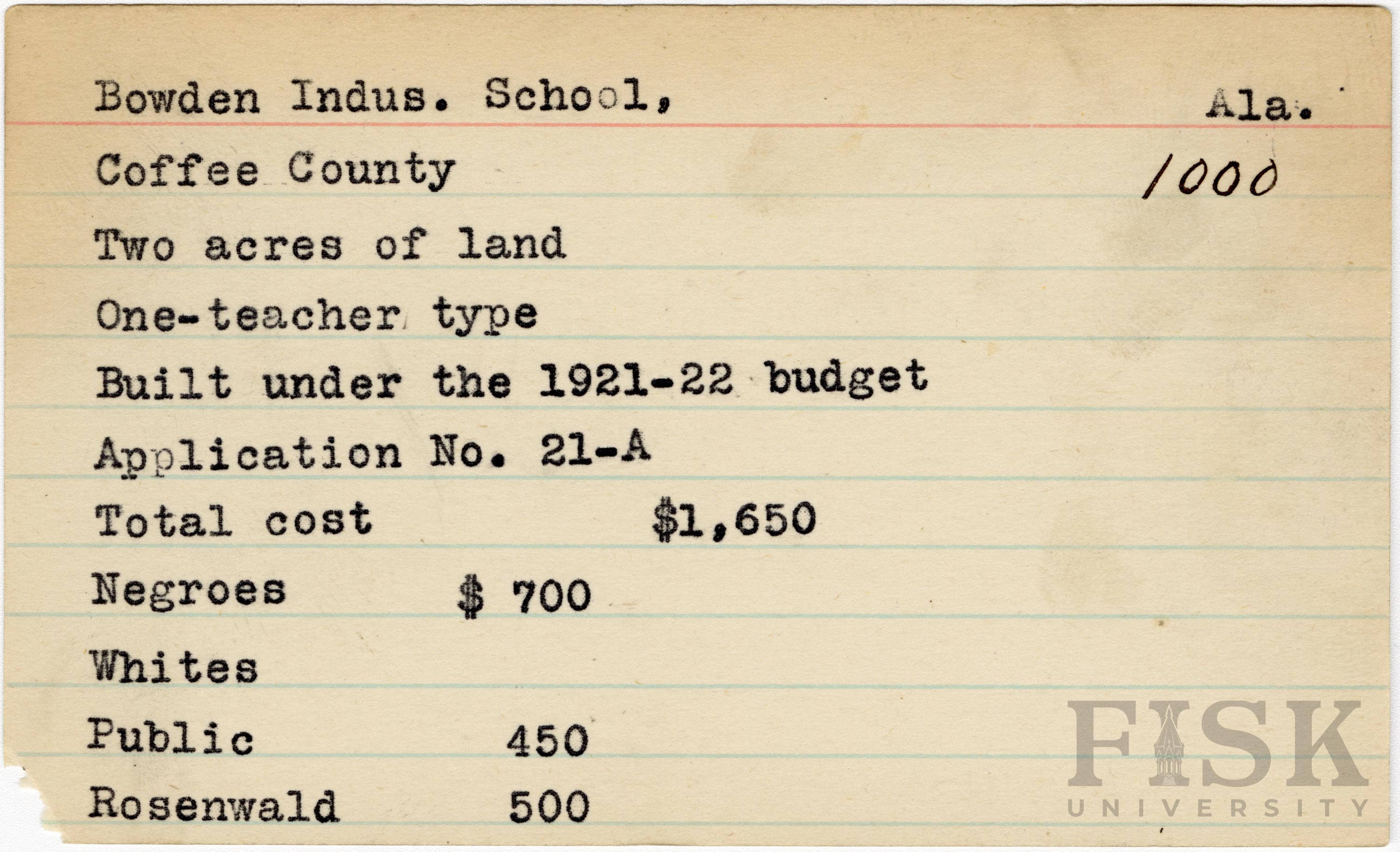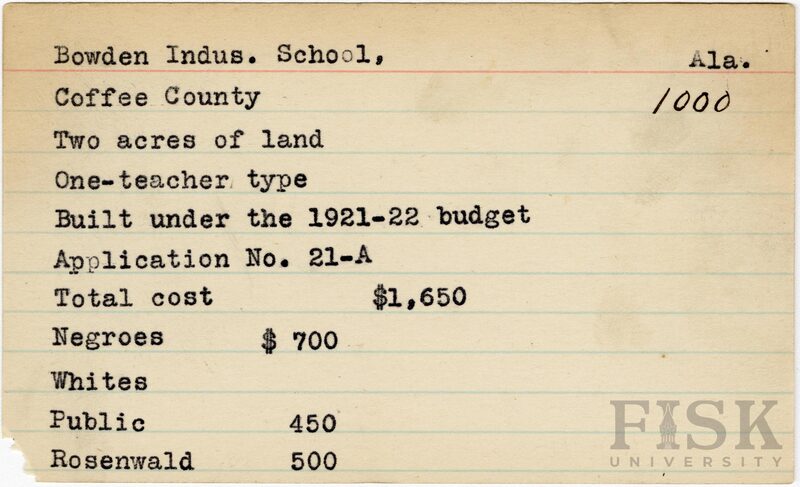 - School card from Rosenwald Fund for Bowden Industrial School in Coffee County, Alabama