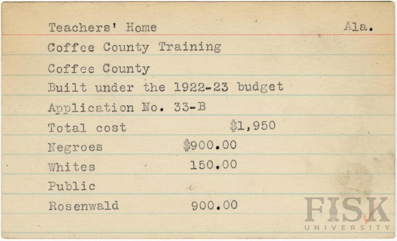 - School card from Rosenwald Fund for the Teacher's Home at County Training School in Coffee County, Alabama