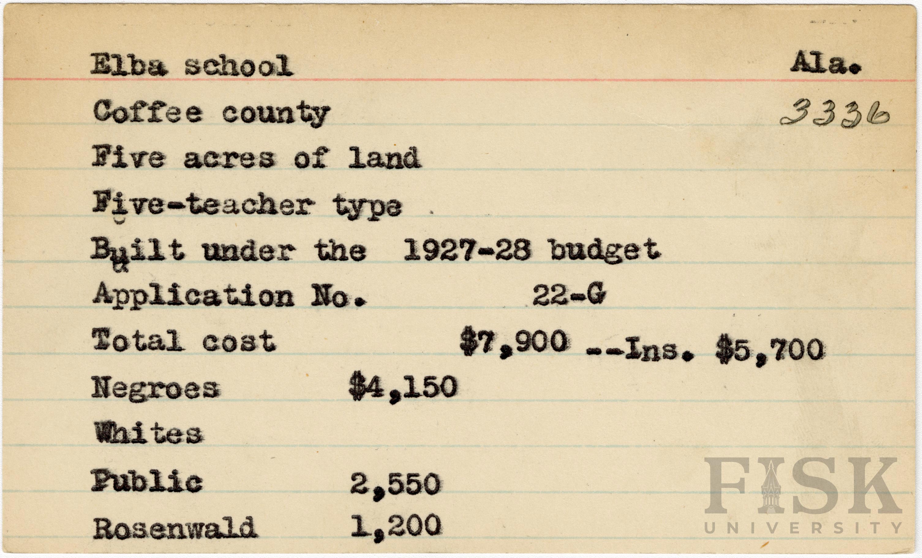 School card from Rosenwald Fund for Elba School in Coffee County, Alabama with a section added to the budget contributions that says, "Ins. $5,700"