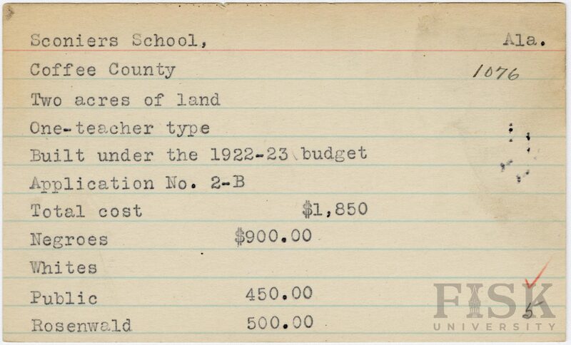 - School card from Rosenwald Fund for Sconiers School in Coffee County, Alabama