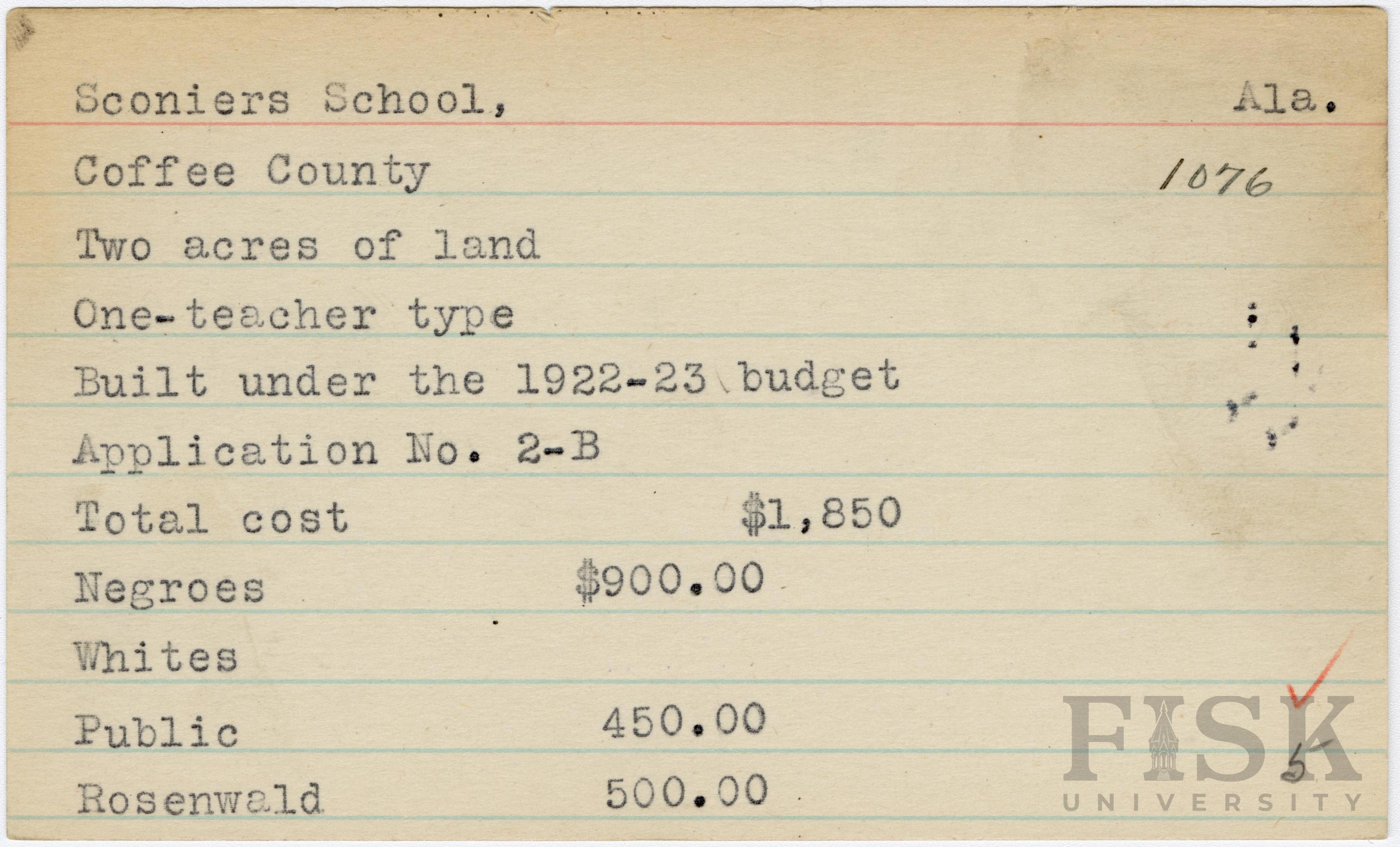 School card from Rosenwald Fund for Sconiers School in Coffee County, Alabama