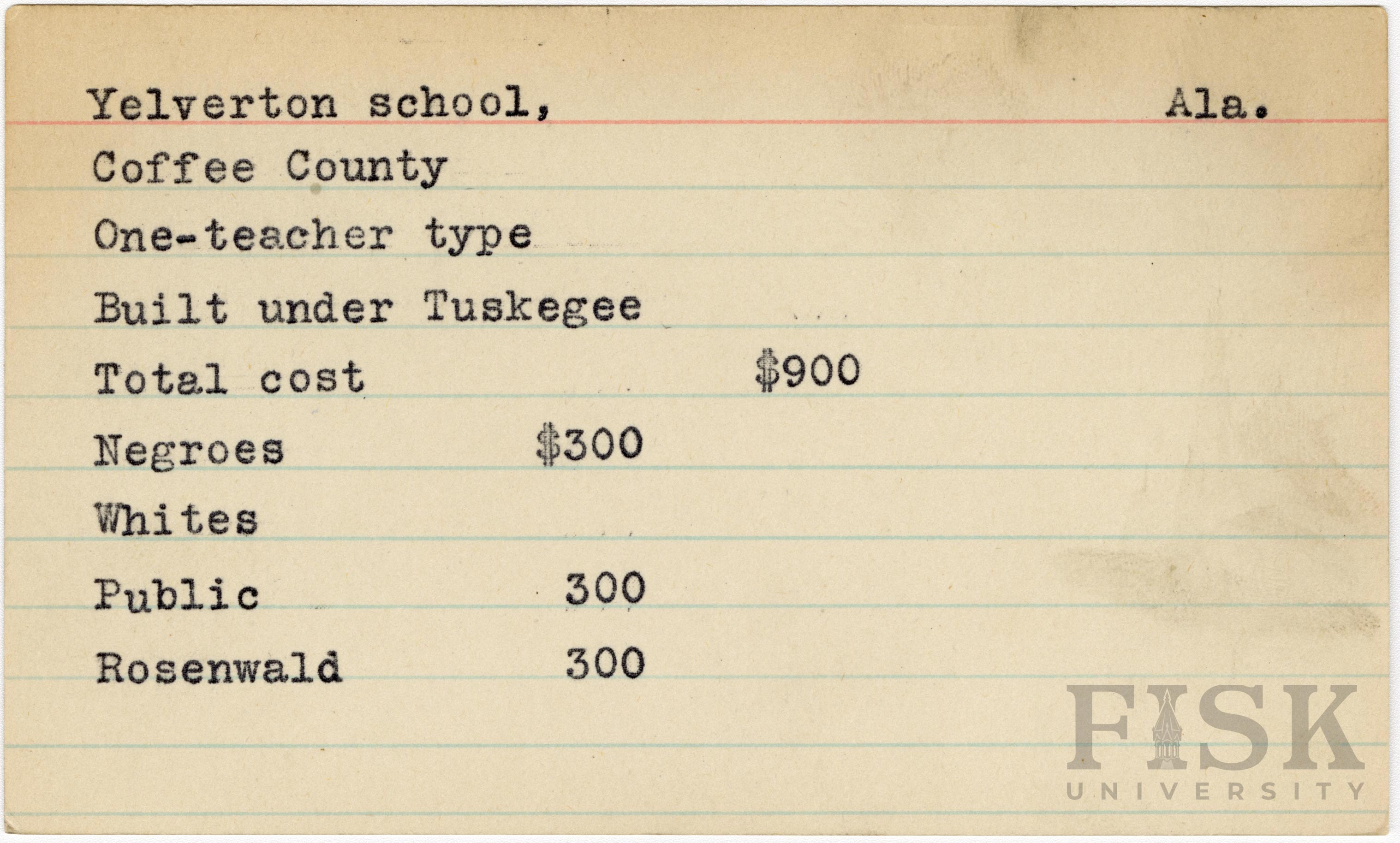- School card from Rosenwald Fund for Yelverton School in Coffee County, Alabama