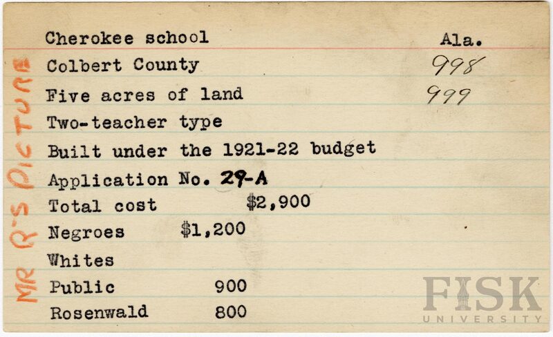 - School card from Rosenwald Fund for Cherokee School in Colbert County, Alabama with a note added to the far left that says, "Mr. R's Picture"
