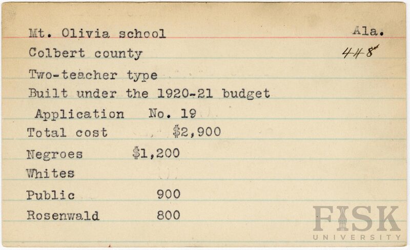 - School card from Rosenwald Fund for Mt. Olivia School in Colbert County, Alabama