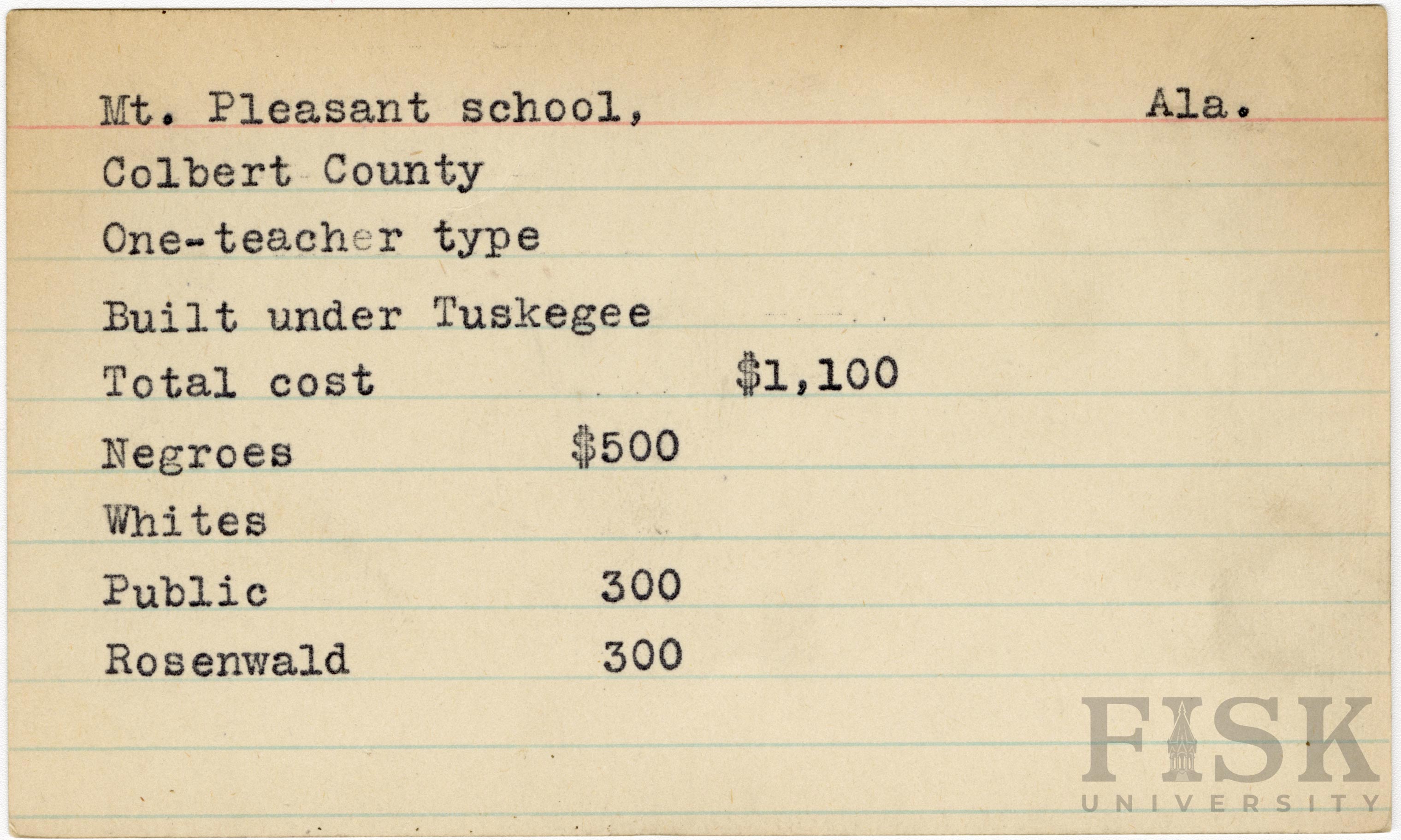 - School card from Rosenwald Fund for Mt. Pleasant School in Colbert County, Alabama