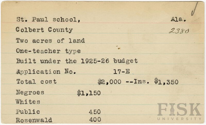 School card from Rosenwald Fund for St. Paul School in Colbert County, Alabama with a section added to the budget contributions that says, "Ins. $1,350"
