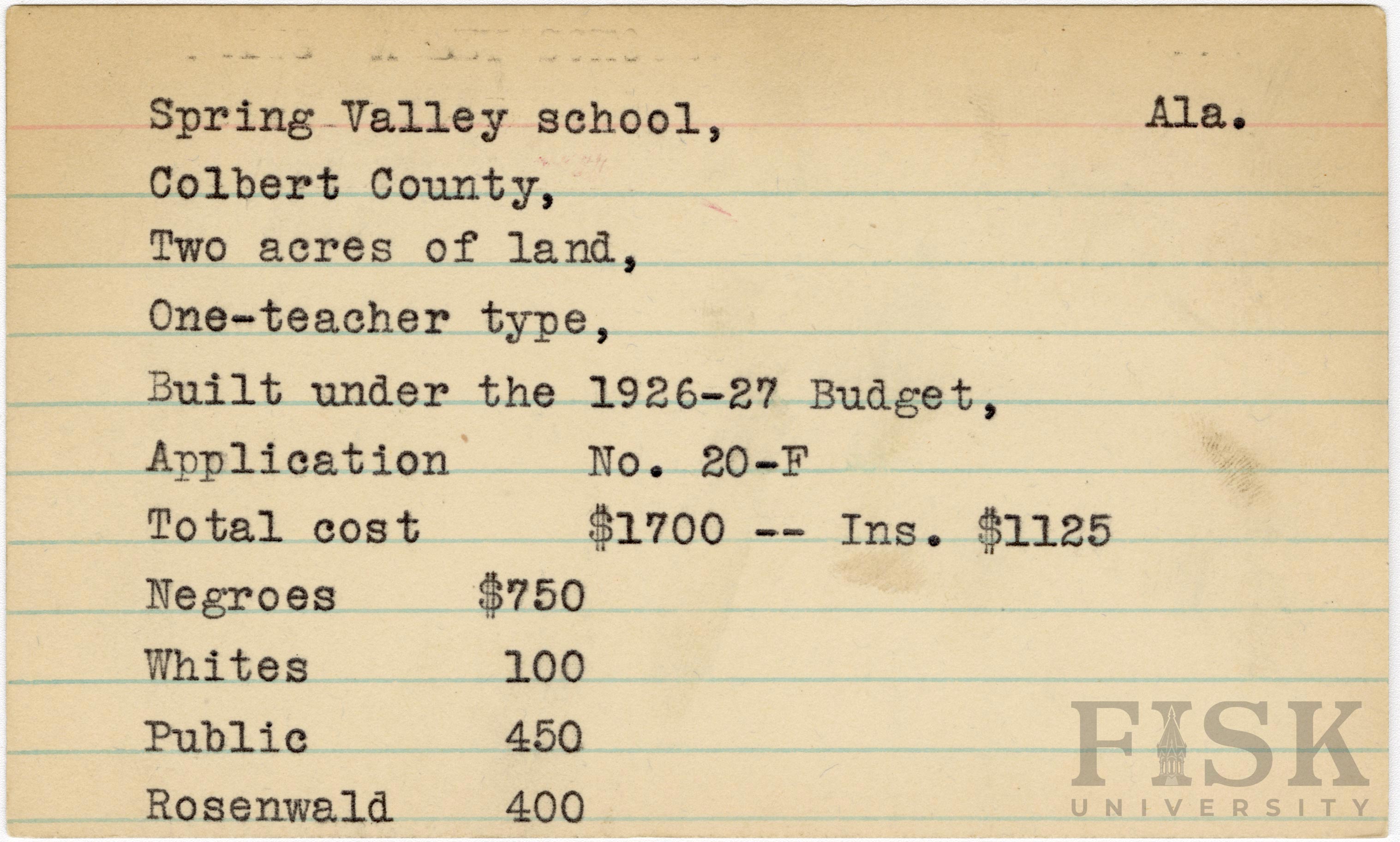 School card from Rosenwald Fund for Spring Valley School in Colbert County, Alabama with a section added to the budget contributions that says, "Ins. $1,125"