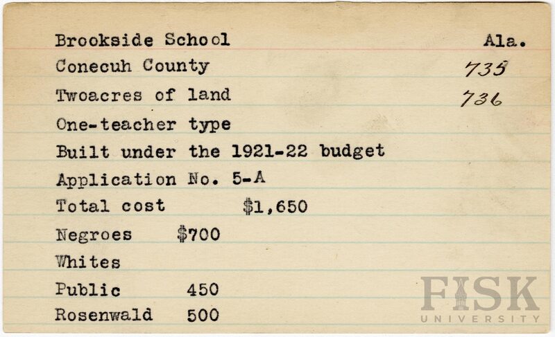 - School card from Rosenwald Fund for Brookside School in Conecuh County, Alabama