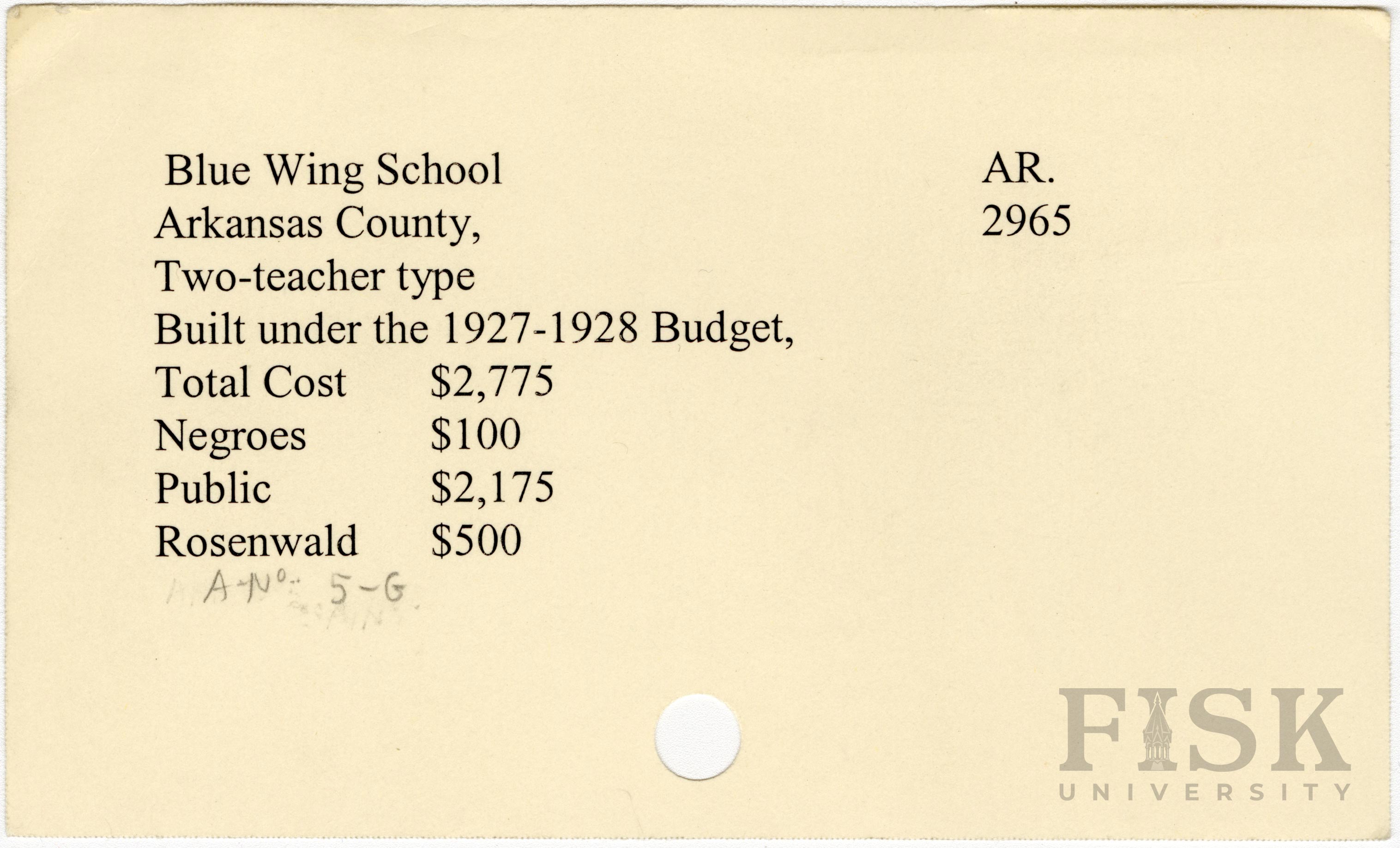 - School card from Rosenwald Fund for Blue Wing School in Arkansas County, Arkansas