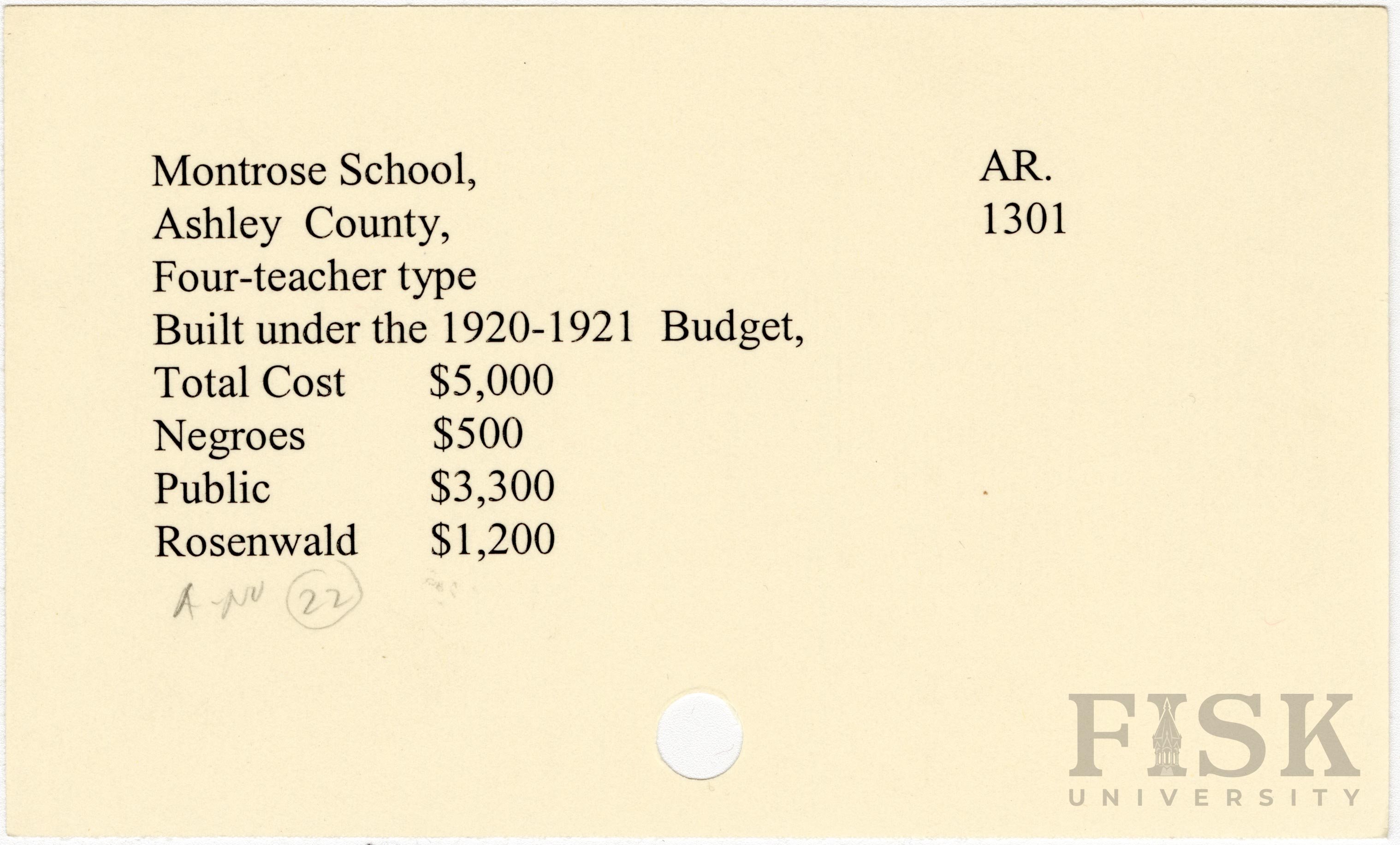 - School card from Rosenwald Fund for Montrose School in Ashley County, Arkansas