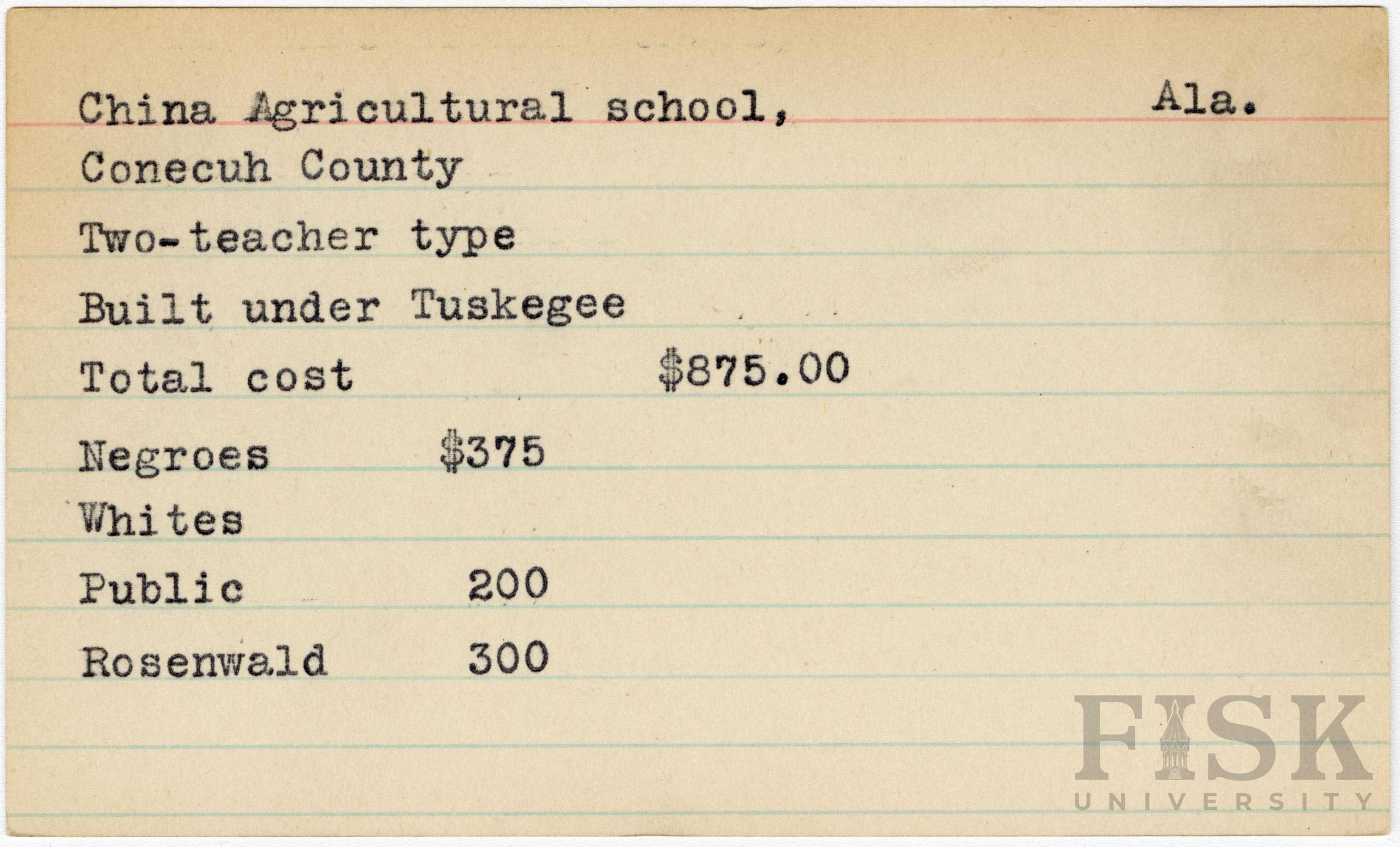 - School card from Rosenwald Fund for China Agricultural School in Conecuh County, Alabama