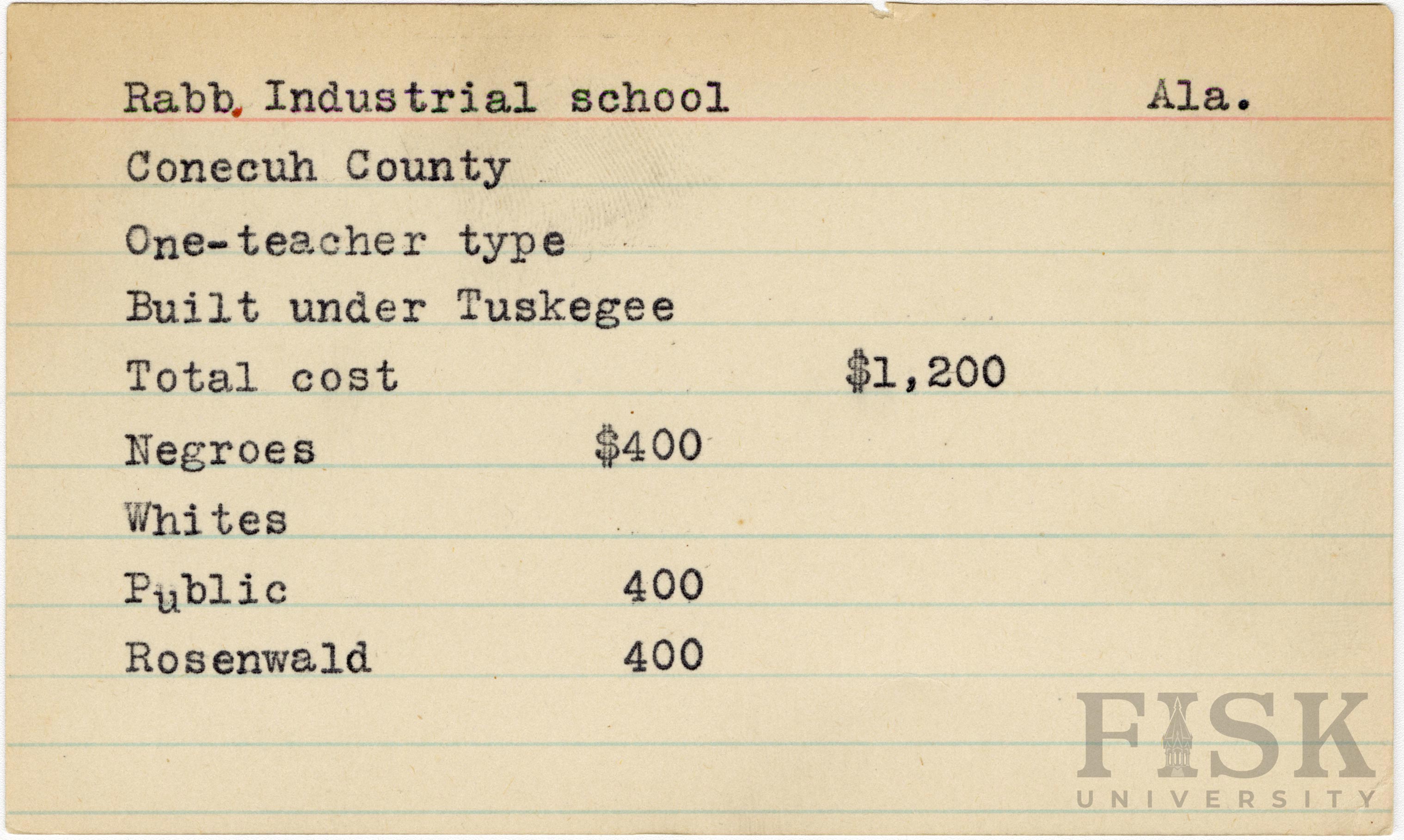 - School card from Rosenwald Fund for Rabb Industrial School in Conecuh County, Alabama