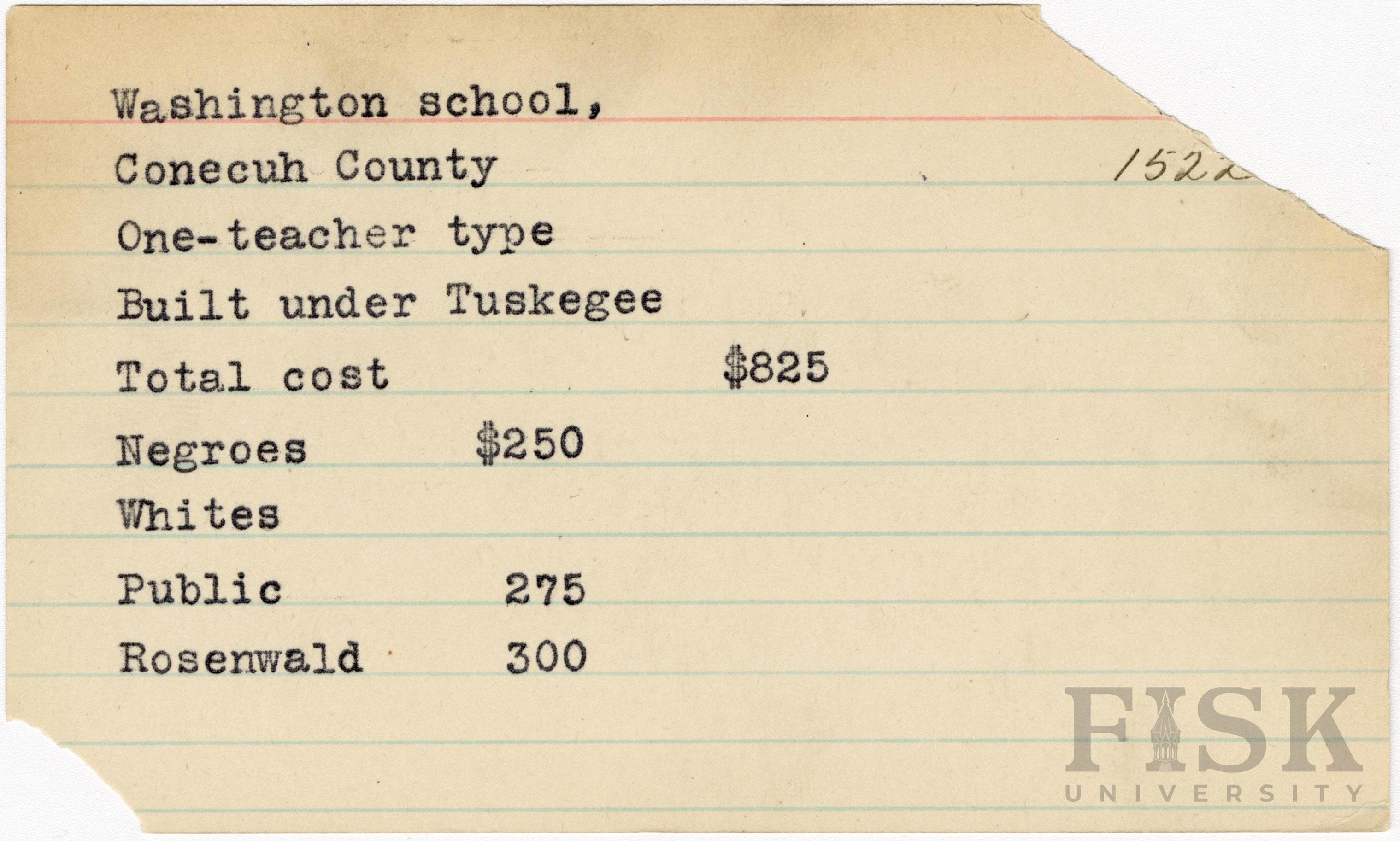 - School card from Rosenwald Fund for Washington School in Conecuh County, Alabama