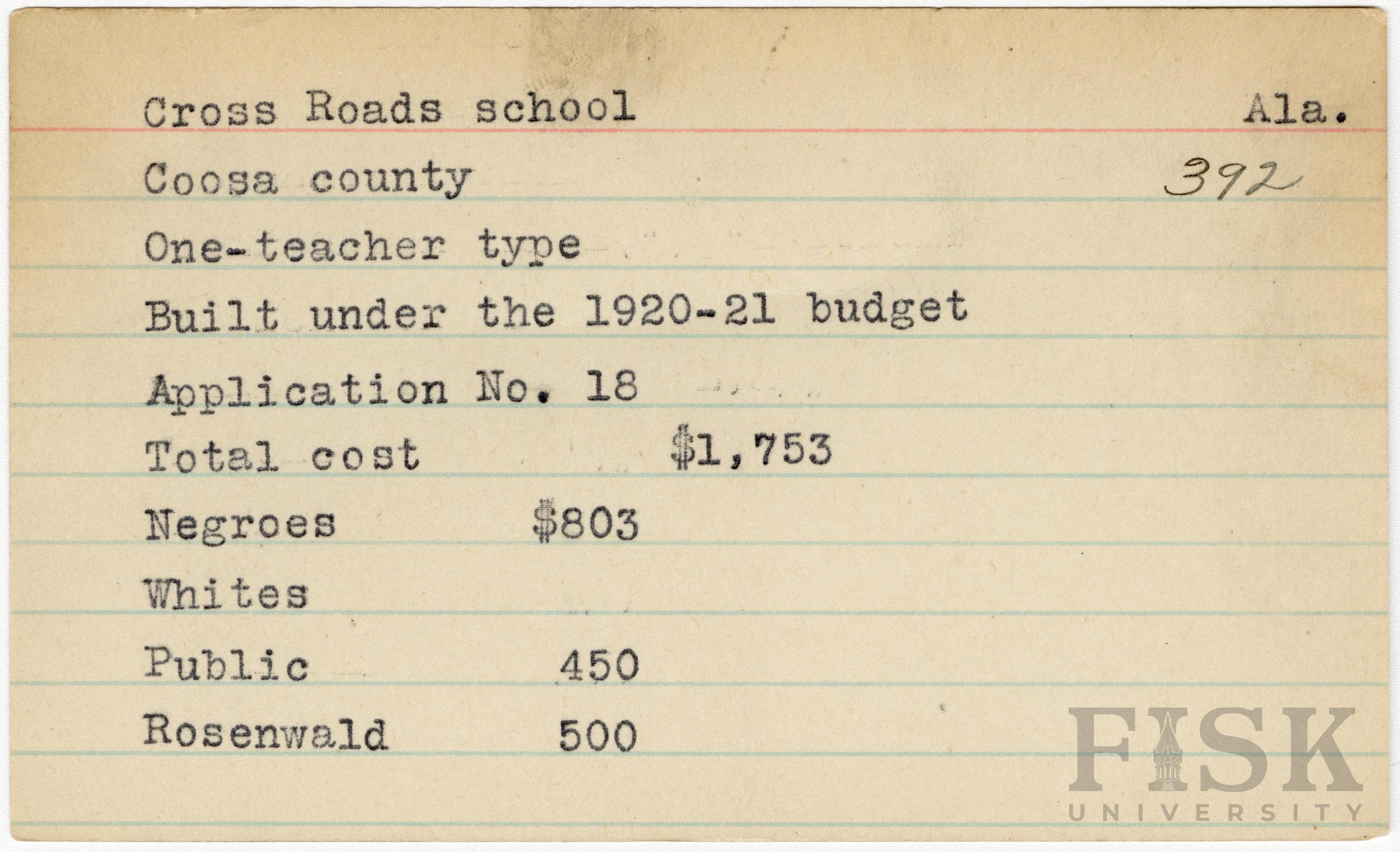 - School card from Rosenwald Fund for Cross Roads School in Coosa County, Alabama
