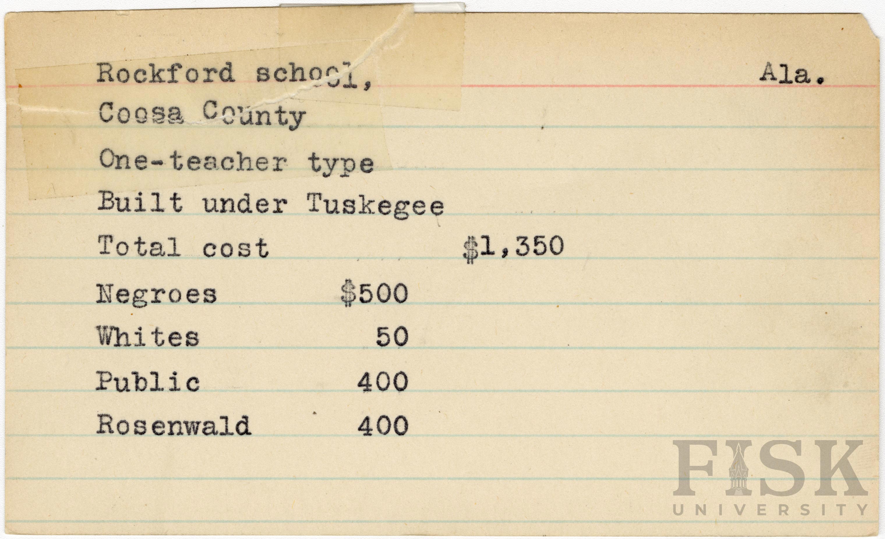 - School card from Rosenwald Fund for Rockford School in Coosa County, Alabama