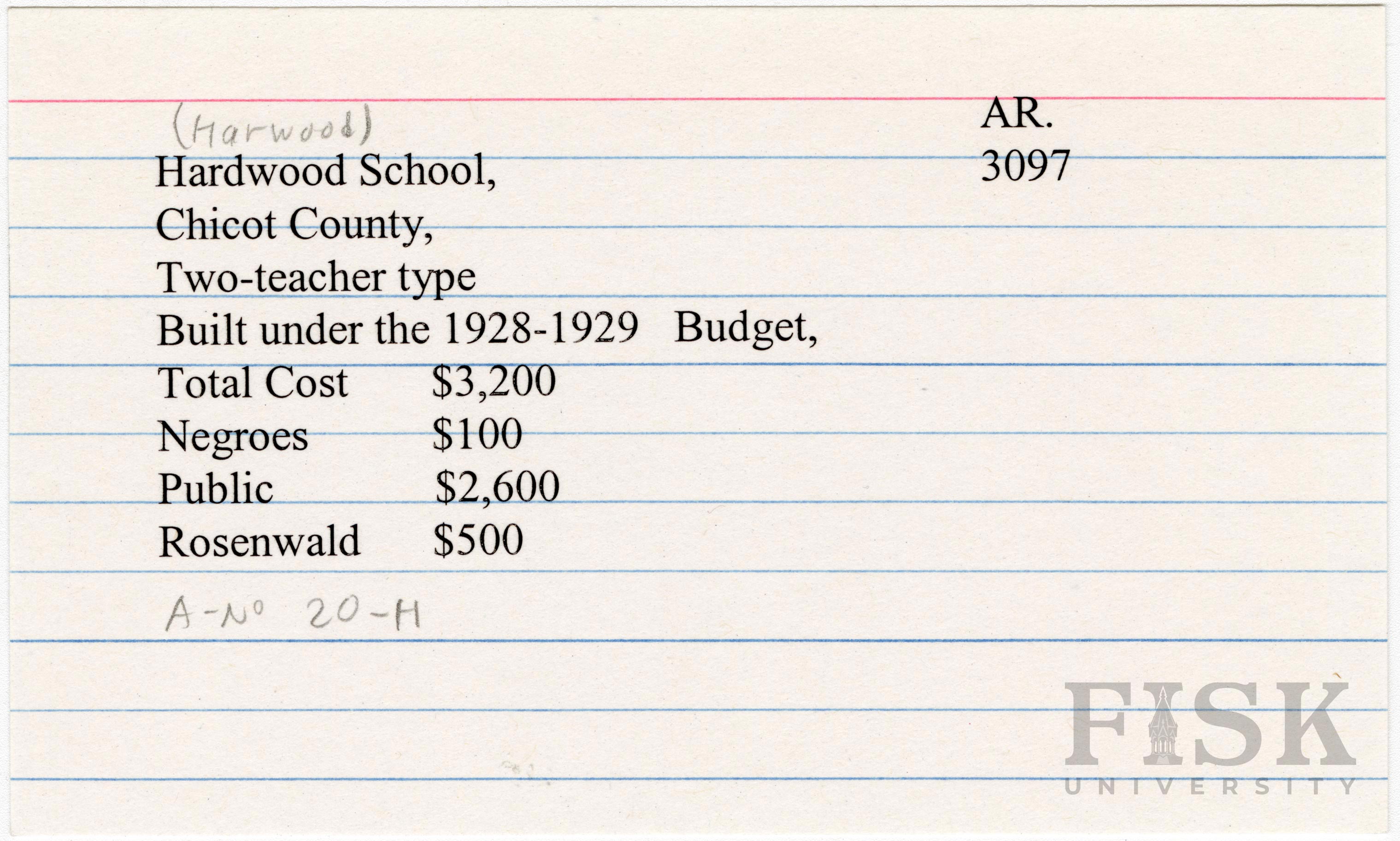- School card from Rosenwald Fund for Hardwood School in Chicot County, Arkansas